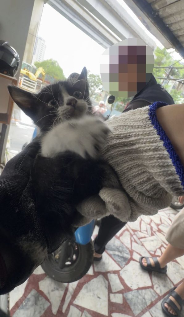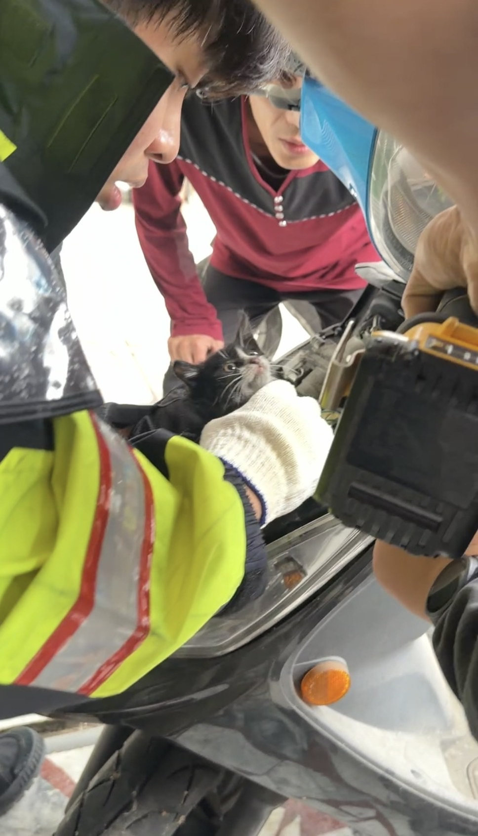 員警迅速趕赴現場,果不其然發現一台機車中斷斷續續發出微弱小貓叫聲,經聯繫車主到場,車主願意配合救援小貓行動,但手邊也無工具可進行車殼拆卸。所幸隔壁便是一家機車維修行,警員陳怡珊連忙向老闆詢問能否提供協助,老闆隨即義不容辭拎著工具過來、小心翼翼拆卸車頭外殼。接著由警員劉呈樟確認查看,發現一隻受驚的小幼貓蜷縮在燈殼內,顯得十分無助,劉員戴上手套細心將小貓抓出並初步檢查,確認小貓並無外傷,且出生應未足3個月,研判為流浪貓,可能是為了躲避風雨鑽入機車內部,卻無法自行脫困。