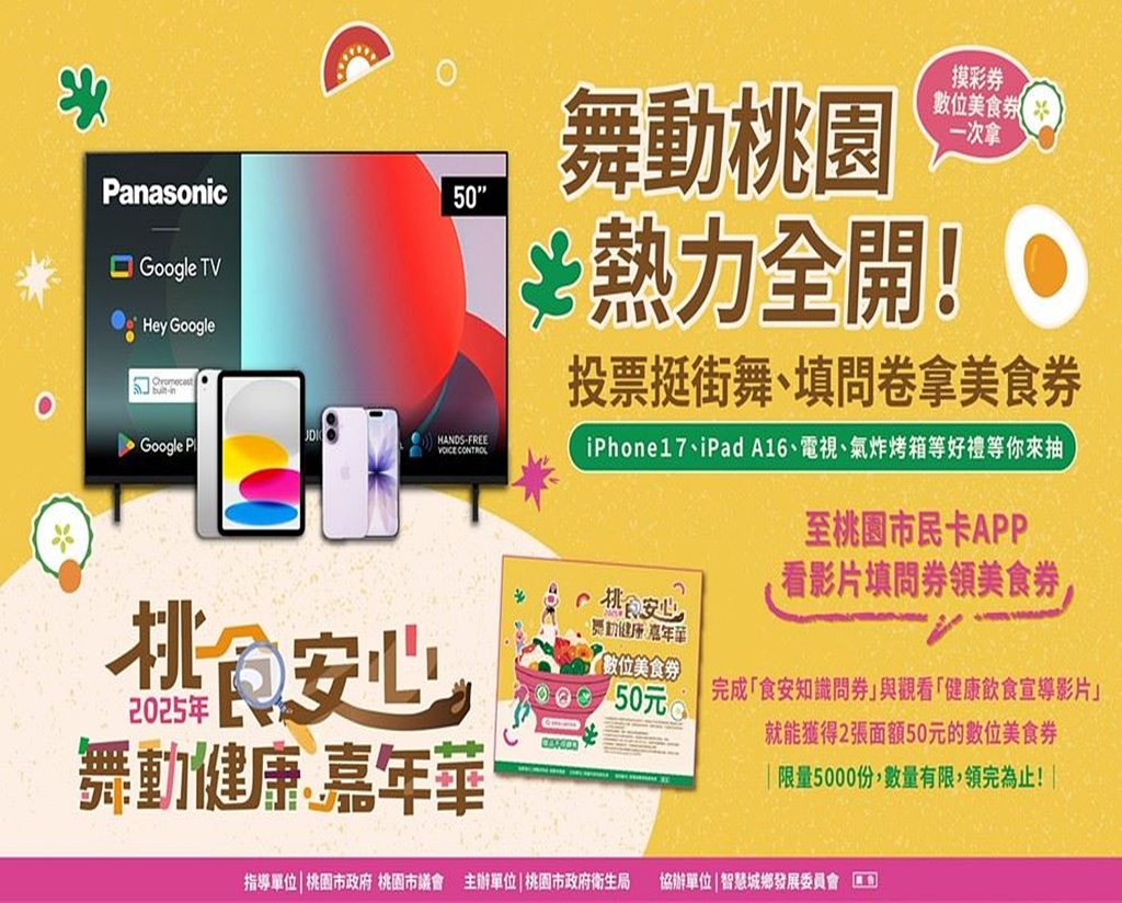 衛生局十二日表示,活動自十一月十日至十一月二十一日舉辦「街舞人氣初選線上投票」,民眾可透過「桃園市民卡APP」欣賞各組參賽隊伍影片並為喜愛的作品投票。投票即可獲得二張摸彩券,完成食安知識問卷與宣導影片再加碼獲得二張面額五十元美食券。本次發出一萬二千張數位美食券,數量有限、送完為止。民眾可自十一月二十五日至一一五年一月三十一日於全市約六百家合作優良餐飲與食品業者兌用優惠折抵,合作名單可上「桃食安心資訊平台」查詢。