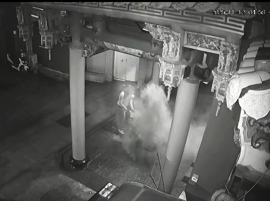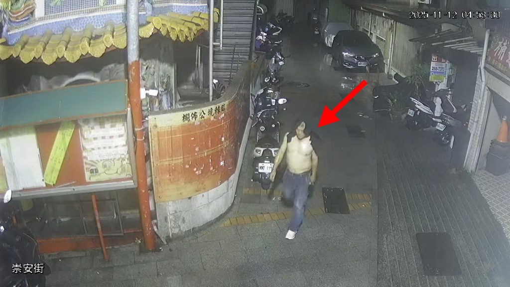 一名男子(紅色箭頭指)從崇安街走進頂土地廟天公爐大玩鐵砂掌,廟方已報警處理。(攝自頂土地監視器畫面)