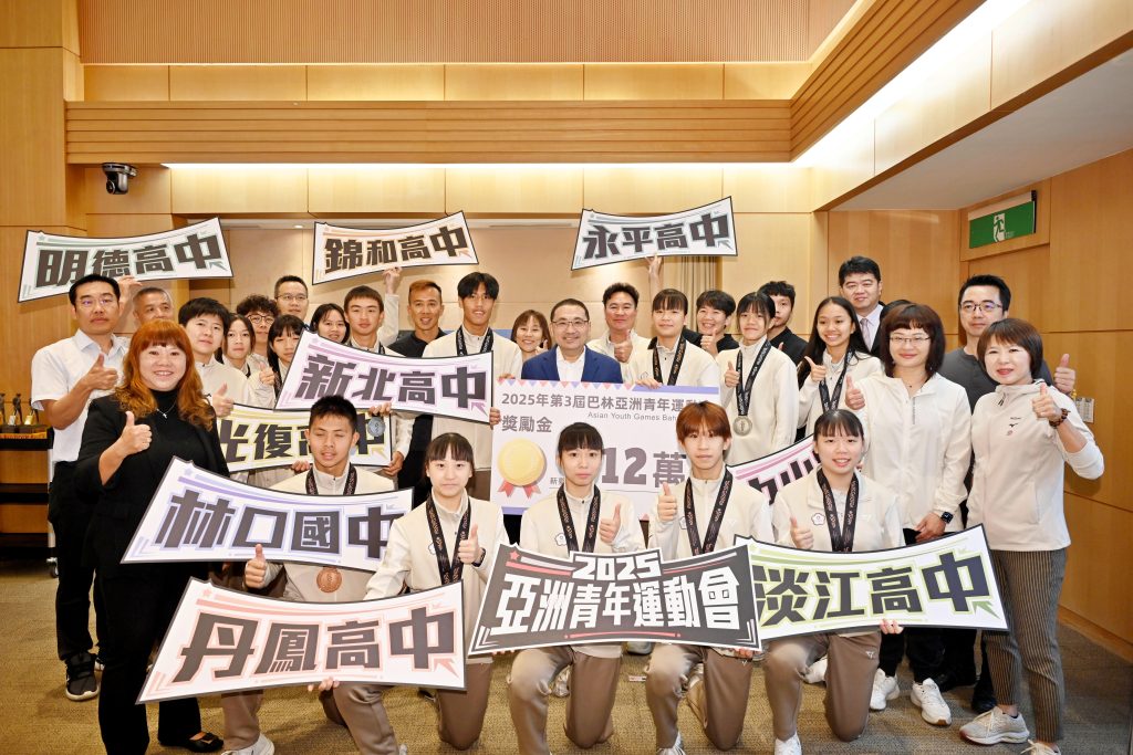 侯友宜親自頒發獎勵金,向選手們表達最高肯定與祝賀。他表示,這群中學生運動員是新北的驕傲,帶著一股激勵的力量,他們不僅為國家爭光,更展現了新北長年推動體育扎根的成果。侯友宜也勉勵選手們持續努力、勇敢追夢,未來挑戰更高殿堂,在奧運等級的國際賽場再次爭取榮耀。