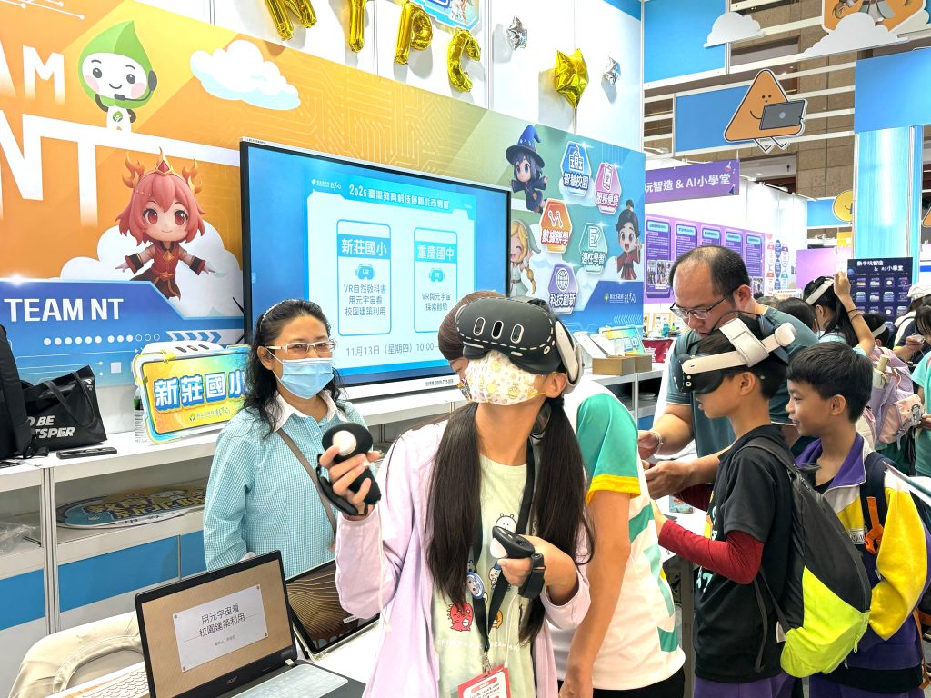教育科技展新北市展區吸引眾多親師生參觀,新莊國小與重慶國中現場展示VR教學應用。(新北教育局提供)