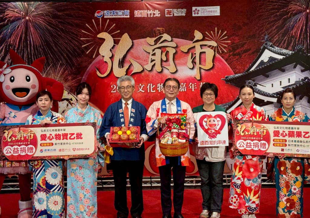 遠百竹北的冬季盛世「二0二五日本青森縣弘前市文化物產嘉年華」即日起至十一月底在七樓古厝區登場。遠東百貨陳佑任副總經理與弘前市櫻田宏市長十三日一同捐贈蘋果一百顆與愛心物資一批給新竹家扶中心,讓有需要幫助的孩童們,在成長路上能夠一切平安且順利。