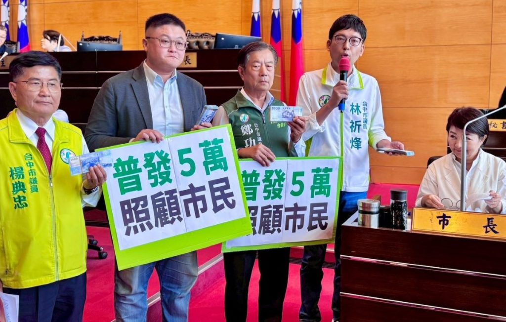 議會市政總質詢第一天,民進黨議員林祈烽、施志昌、楊典忠及鄭功進表示,盧秀燕先前曾高喊「普發現金是政府把人民的錢還給人民」,因此各以五萬元現金代表全體市民的希望,並將這二十萬元留給盧秀燕,提醒市長儘速普發五萬元。