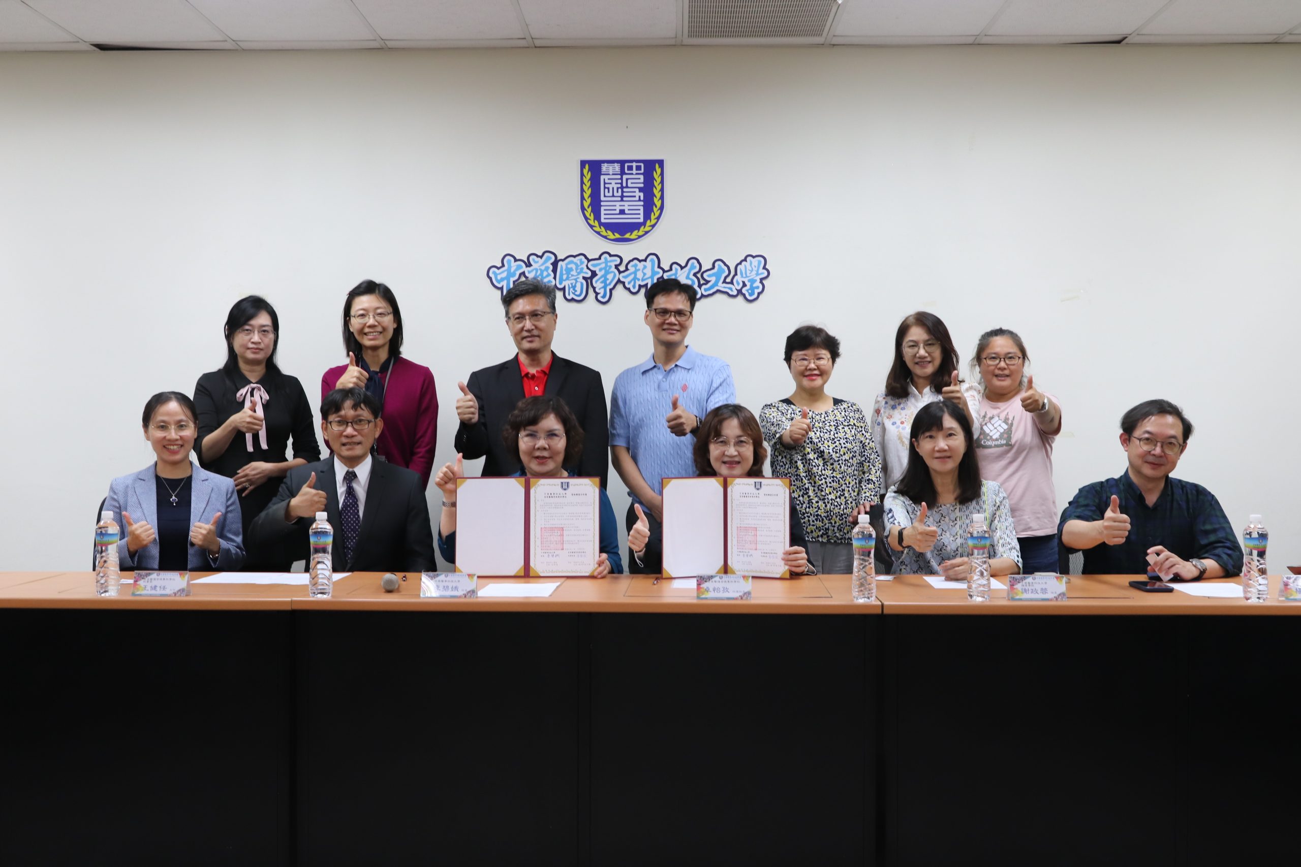 簽約結盟儀式在中華醫大舉行,由中華醫大校長李碧娥和育英醫專代理校長卓怡孜代表雙方簽署,中華醫大醫事學院院長楊堉麟、護理學院院長謝政蓉、民生學院院長姜泰安等三院院長偕同相關系科主任,育英醫專秘書室主任王健任、護理科主任陳孟勤、老人健康服務事業管理科主任林盈諄、化妝品應用與管理科主任朱立雯等,一起出席見證雙方啟動跨校合作契機。