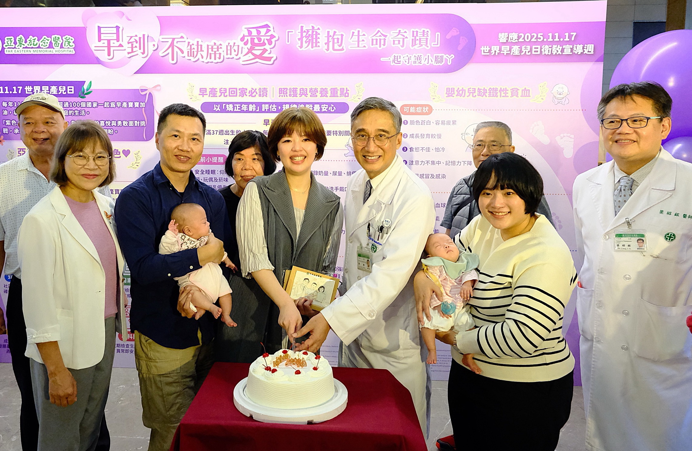 迎接十一月十七日世界早產兒日,亞東醫院十三日舉辦「早到不缺席的愛」衛教講座,特別邀請在亞東醫院照顧過最年幼的早產寶寶,今年四月出生時僅600公克的小粉圓和媽媽一起回娘家慶生,小女嬰目前體重已達4100公克,健康活潑,讓現場醫護、來賓參與人員為之欣喜,呼籲社會大眾,予早產兒及家庭更多理解、支持與陪伴。