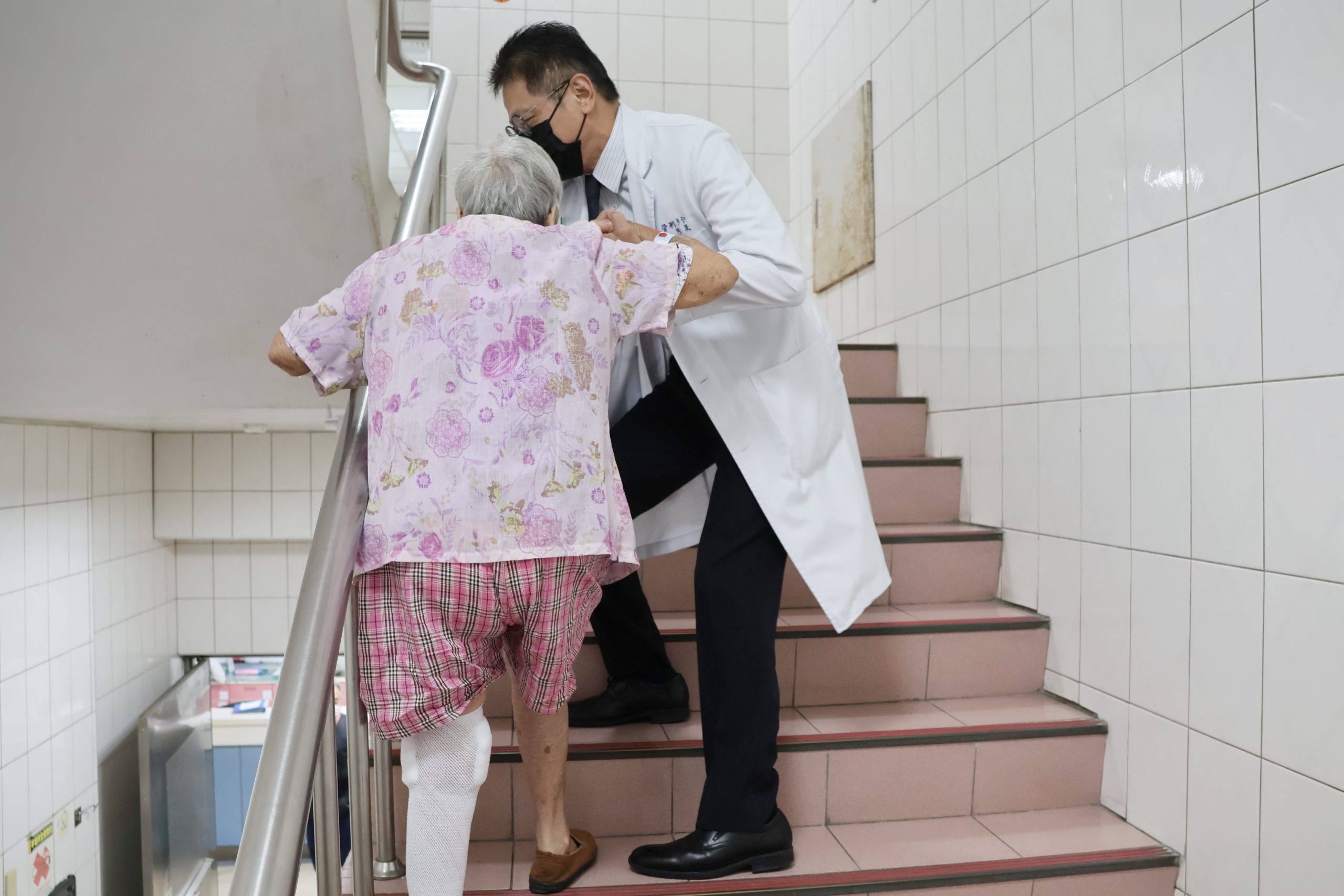大甲李綜合醫院骨科主任王芳英(右)帶著堅持開刀換膝蓋的百歲人瑞慢走樓梯復健。(記者陳榮昌攝)
