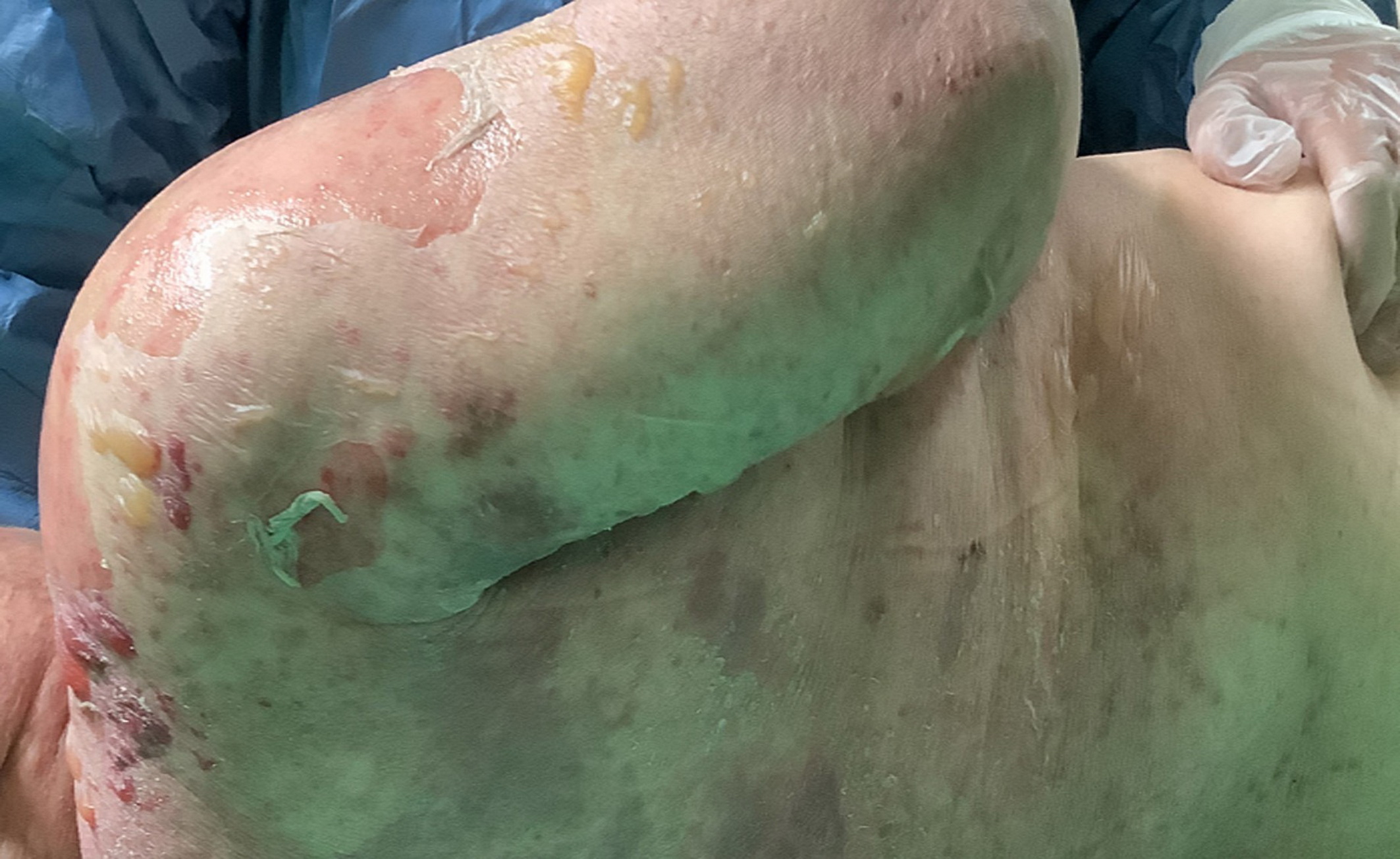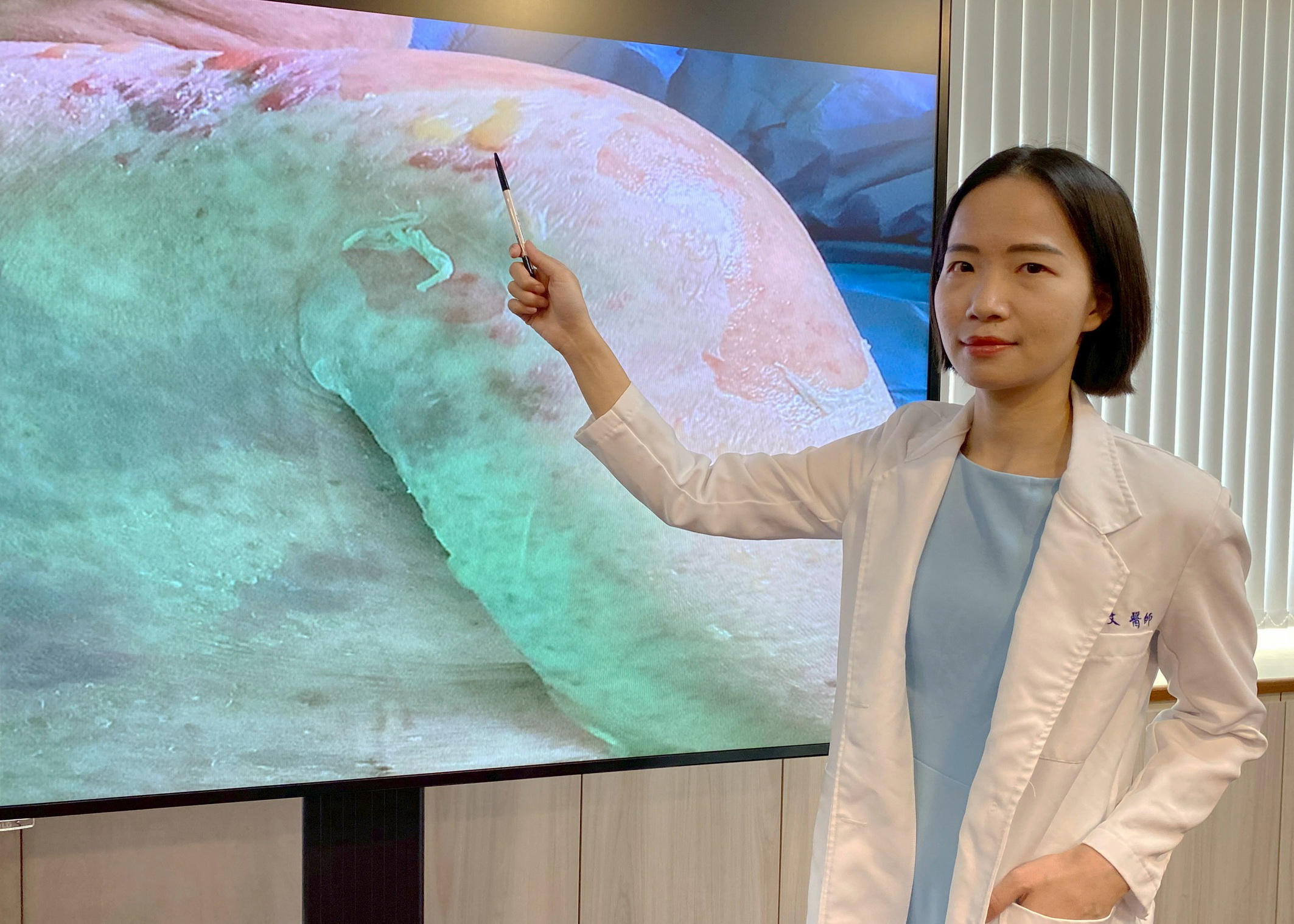 中榮過敏風濕免疫及一般內科醫師陳韻文解釋,罹患史帝文強生症候群的病人全身會出現紅疹與水泡,皮膚如同水蜜桃般脆弱。(記者陳金龍攝)