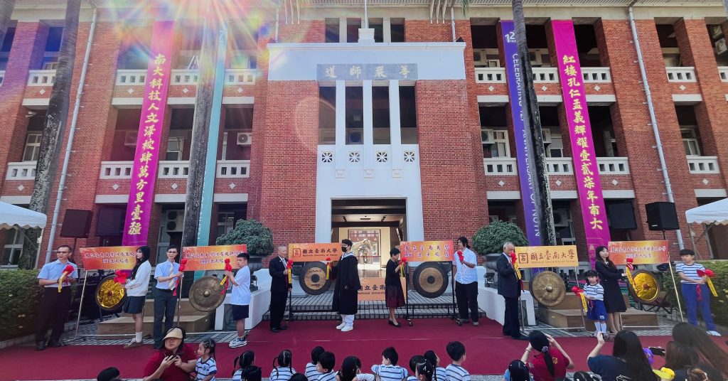 南大校長陳惠萍、附設實驗小學校長楊怡婷、附聰校長郭勇佐、附屬中學校長曾河嶸及吳鐵雄、吳東林、學生代表,一同敲響六面銅鑼十二聲,宣告一二七週年校慶正式展開,也回應著南大百餘年間累積的底蘊與力量。