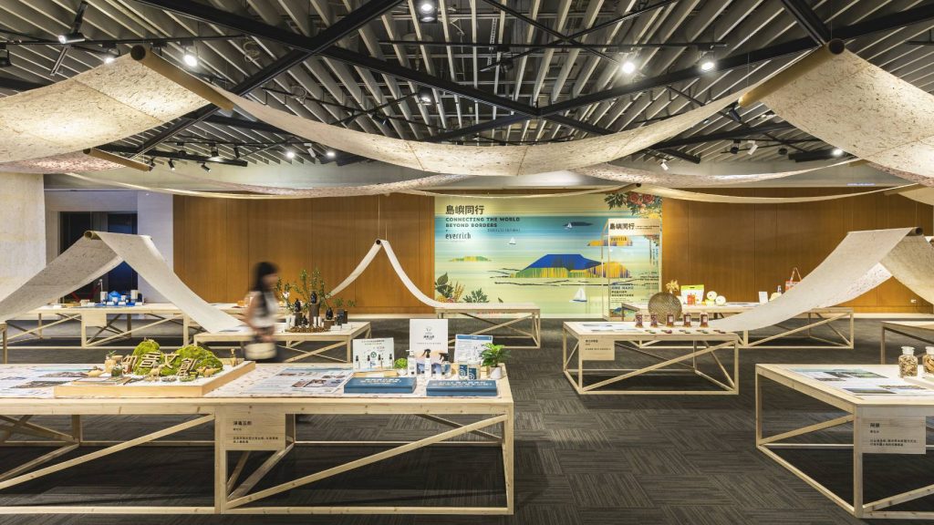 此次展覽以「島嶼同行」為主題,串聯全台 15 家地方品牌,包括:Story Wear、春日好日、阿原、歐文瓷、知音文創、淨毒五郎、大賀米、茶籽堂、錦源興、佐見啦、舊振南、緣親鳳梨、芙彤園、遊山茶訪與謝江林茶莊。從北到南、從山到海,呈現台灣產業兼具傳統與創新、環境與文化共生的多元風貌。展區特別選用南投埔里「廣興紙寮」的手工藝術紙張,以波浪造型象徵台灣山海地景的律動。紙材結合平溪天燈、鞭炮屑與中藥渣等再生素材,化身為承載台灣傳統工藝與產業歷史記憶的永續媒材,呼應昇恆昌推動永續與文化傳承的精神。