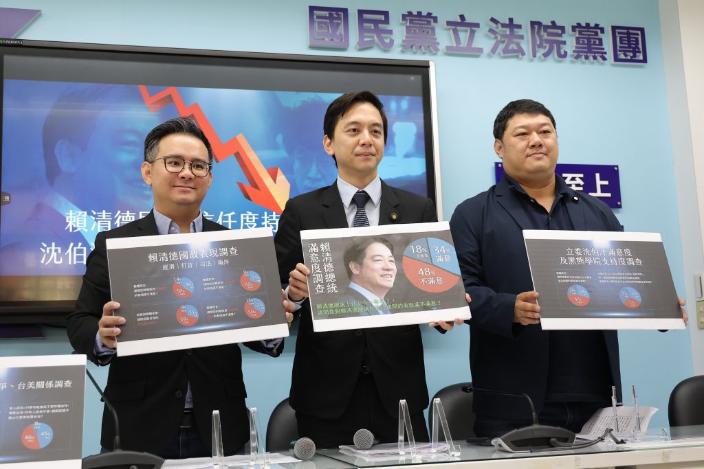 國民黨立委牛煦庭、黃健豪、游顥十四日公布最新國政民調指出,賴清德總統施政在多項指標上不滿意度均高於滿意度。調查顯示,賴總統整體施政滿意度為三成四、不滿意為四成八;在政府推動經濟發展部分,滿意為三成六、不滿意為五成;在打擊詐騙部分,滿意為三成一、不滿意為六成;在台灣整體司法信任度部分,滿意為三成一、不滿意為五成九。