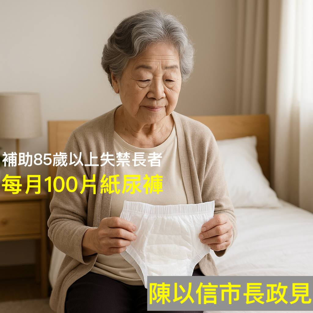 台南市邁入高齡化社會,根據統計,全市約有三萬九千名八十五歲以上長者,依照失能比例推估,約一萬八千名失能者,前立委陳以信宣布長照政見,推動「補助台南市八十五歲以上失禁失能長者,每月一百片成人紙尿褲」,降低家庭照護負擔改善長者生活品質。