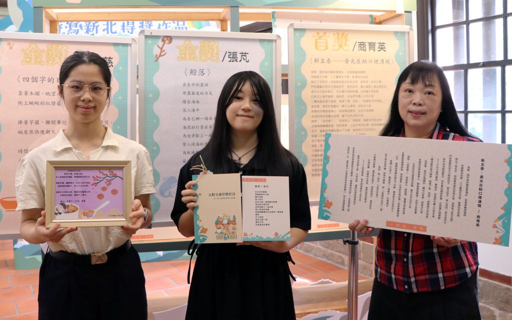 二0二五新北詩歌節「詩寫新北」昨日頒獎,各組獲得金獎者:國小組張心慈、國中組張芃、一般組商育英(由左至右)。 (記者吳瀛洲攝)
