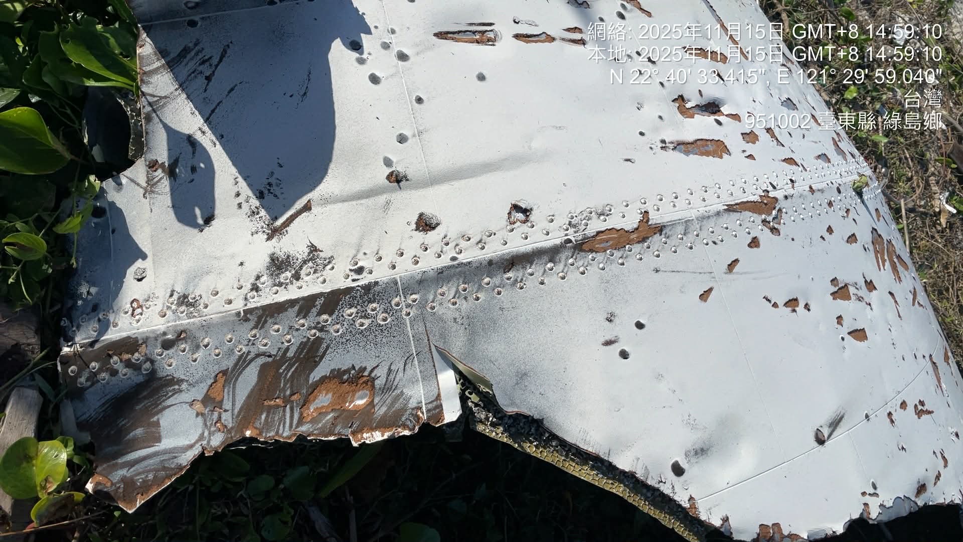 綠島鄉民田鴻銘表示,下午他前往綠島監獄附近的流麻溝出海口,發現一塊複合材料,感覺好像是飛機蒙皮或是火箭殘骸,長、寬各約二百公分,白色,有鉚釘。
