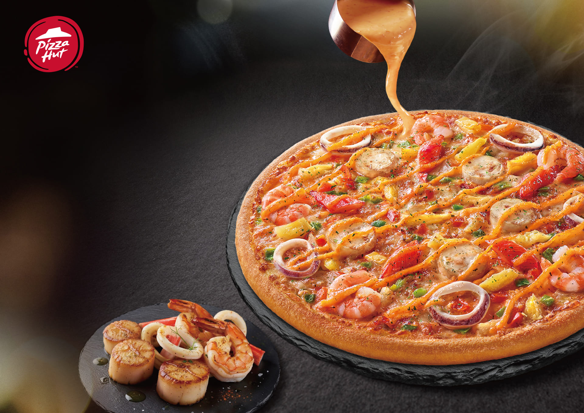 必勝客全新「千島海鮮盛宴比薩」豪邁鋪滿極選干貝、鮮嫩大蝦與Q彈魷魚圈,搭配黃金比例特製千島醬,海鮮控別錯過!