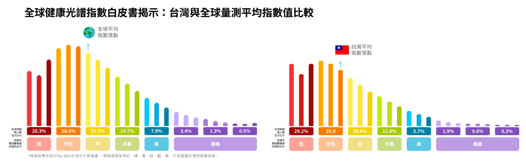 台灣在科技與經濟領域表現亮眼,卻在健康表現上仍有進步空間。衛福部國健署指出,多數台灣民眾每日蔬果攝取量不足,尤其上班族因外食與工作壓力導致營養失衡。儘管營養品台灣市場銷售規模突破新台幣1600億元,反映國人對健康的重視與投入,但 Nu Skin 於近日發布的《全球健康光譜指數白皮書》顯示,相較全球平均,台灣民眾的健康光譜指數仍偏低,呈現「有補,但沒補足健康缺口」的現象。
