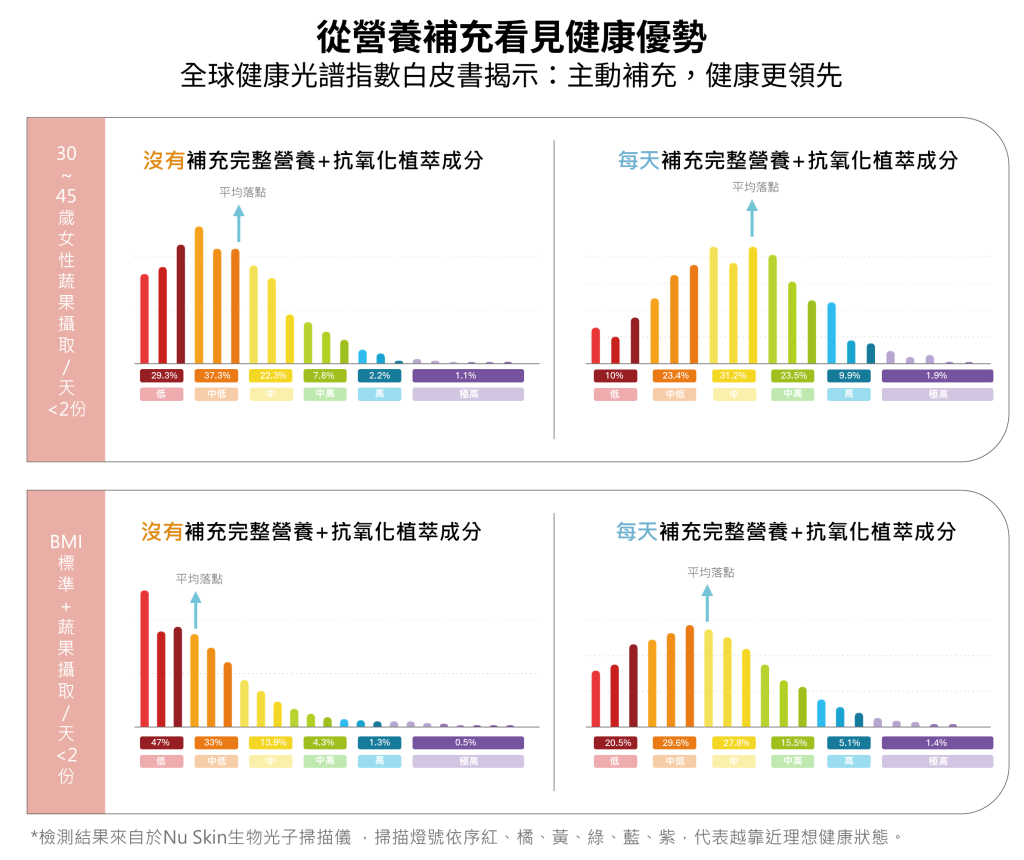 Nu Skin 透過領先業界超過20年,2,100萬筆大健康數據,分析出影響健康光譜指數的四大關鍵-蔬果攝取、生活習慣、體態管理與營養補充,呼籲大眾應透過個人化預防性的自我健康量測,讓「健康不再憑感覺」,唯有以數據為依據,才能真正將健康「補到位」。