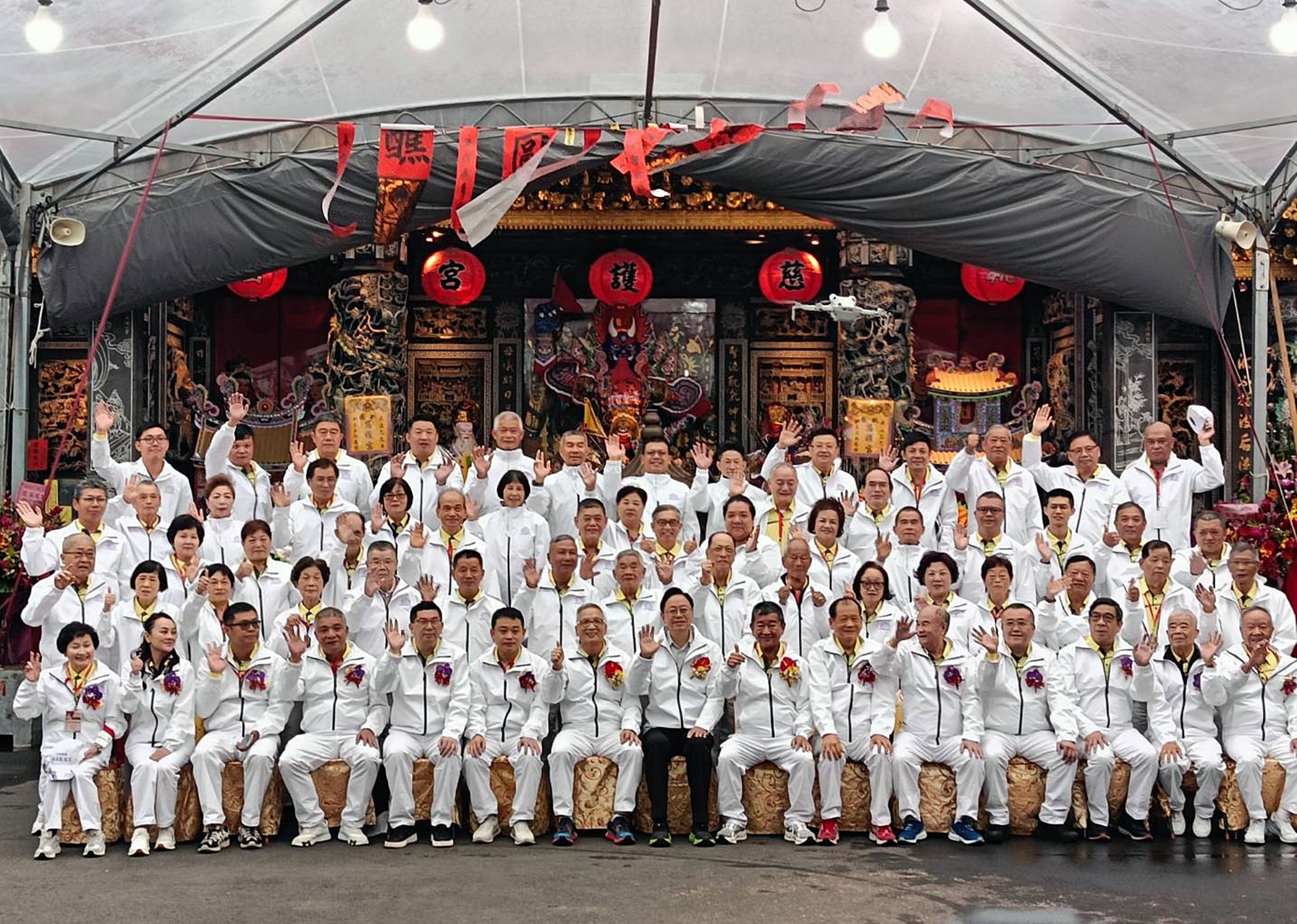 桃園市長張善政參加慈護宮「酬恩五朝圓醮」活動與慈護宮管委會理監事們合影。(記者陳華興攝)