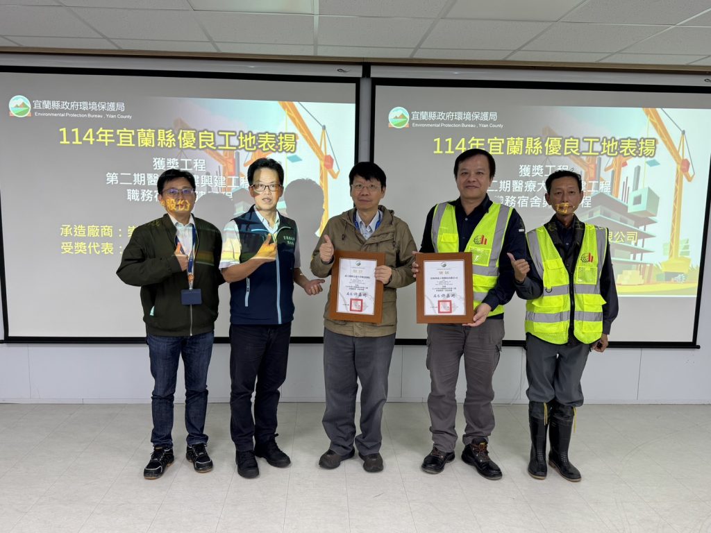 此次活動於陽明交通大學附設醫院(蘭陽院區)施工現場舉行,由環保局代表頒發「優良營建工地獎」予營建業主國立陽明交通大學附設醫院及承攬廠商崇偉營造工程股份有限公司,表彰其在環境維護上卓越表現。典禮後並舉行工地現場觀摩交流,邀請縣內前五十大營建工程(含公、私部門)之業主及承包商共同參與,透過現場導覽與經驗分享,推動營建環保知能交流。