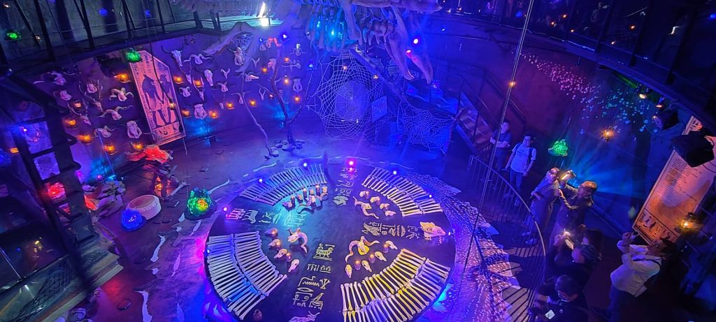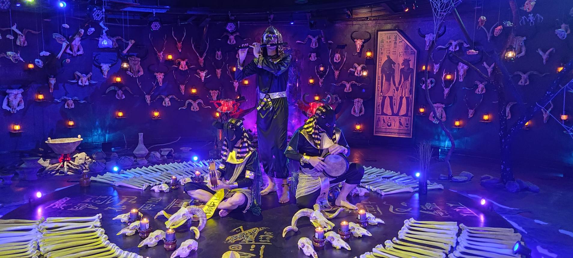 「獸骨祭壇」創意沉浸劇場是十鼓文創園區繼《魔法工廠》、《魔法彩虹街》、《魔域王座》、《時空魔花》之後推出的全新場景,主要作為參觀場景、觀眾體驗及祭司演出的場館。其設計靈感源自古老埃及文明的獻祭儀式,透過獸骨堆砌、藍色鬼火與綠色異火交織的冷暖光影,象徵人類與靈界間的交流與能量循環。