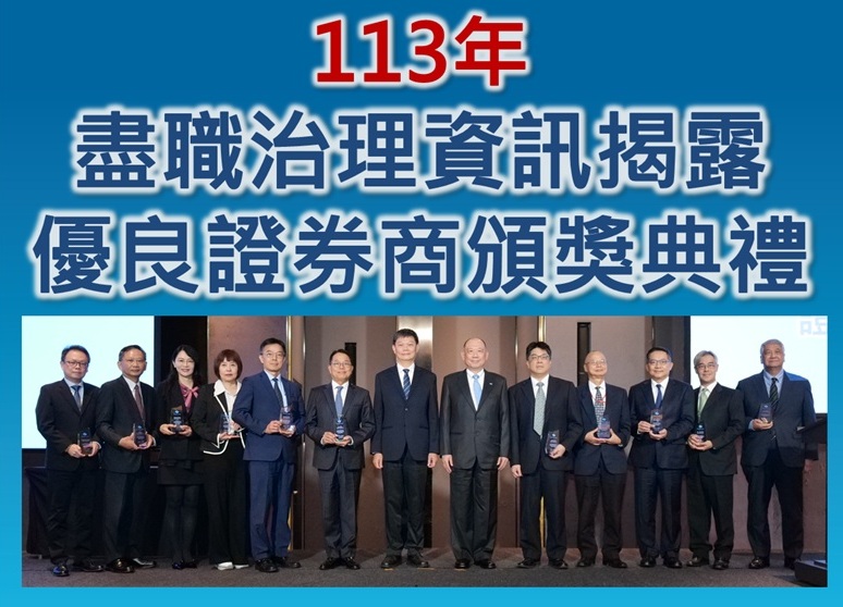 臺灣證券交易所股份有限公司於今(114)年11月18日舉辦「114 年度證券經紀商及自營商高階主管業務宣導會」暨「113年度機構投資人盡職治理資訊揭露優良證券商頒獎典禮」,邀請金管會證券期貨局、證券商公會以及證券商經紀與自營高階主管共同參與,約120餘人出席,活動順利圓滿結束。本次會議共表揚11家於113年度盡職治理資訊揭露表現優異之證券商,顯示業者對履行機構投資人責任的重視程度持續提升,有助強化我國資本市場的公司治理品質,金管會及證交所對得獎證券商均表達肯定之意,並藉此感謝券商同業長期支持各項政策措施,攜手推動我國資本市場治理品質持續精進。