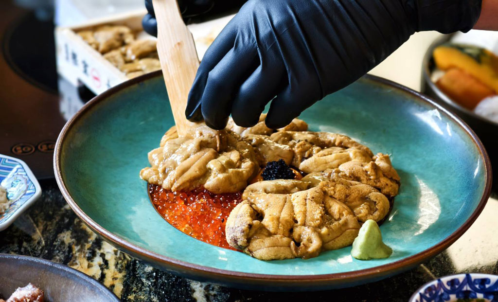 特製「綜合菜盤」也是橋山一大特色,精選日本大蔥、蒟蒻絲與日本鱈寶,預先汆燙根莖類蔬菜,不僅能減少現場烹調時間,同時能保留鮮甜與脆嫩。海鮮愛好者推薦必點橋「爆量極上雲丹丼」,超大份量適合6人共享,即日起至2026年1月31日限期供應,特價4680元,以特製醋飯為基底,鋪上海量鮭魚卵與飽滿生蛋黃色妝點,專人桌邊海膽秀服務,直接把視覺感拉滿,加碼送北海道干貝乙份。