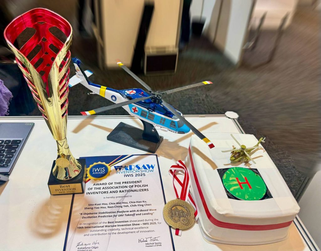 歐盟第二大國際發明展「2025第十九屆波蘭國際發明展」圓滿結束,共有二十六國三四六件作品參展,屏科大智慧機電學士學位學程徐子圭教授團隊與海空軍及中研院共同合作的「艦載AI抗浪防震無人機起降坪」作品,成功解決中小型船舶因風浪造成無人機起降危險的問題,以突破性的技術榮獲金獎及大會最佳發明創作獎,成功點亮屏科大在全球舞台的研發能量。