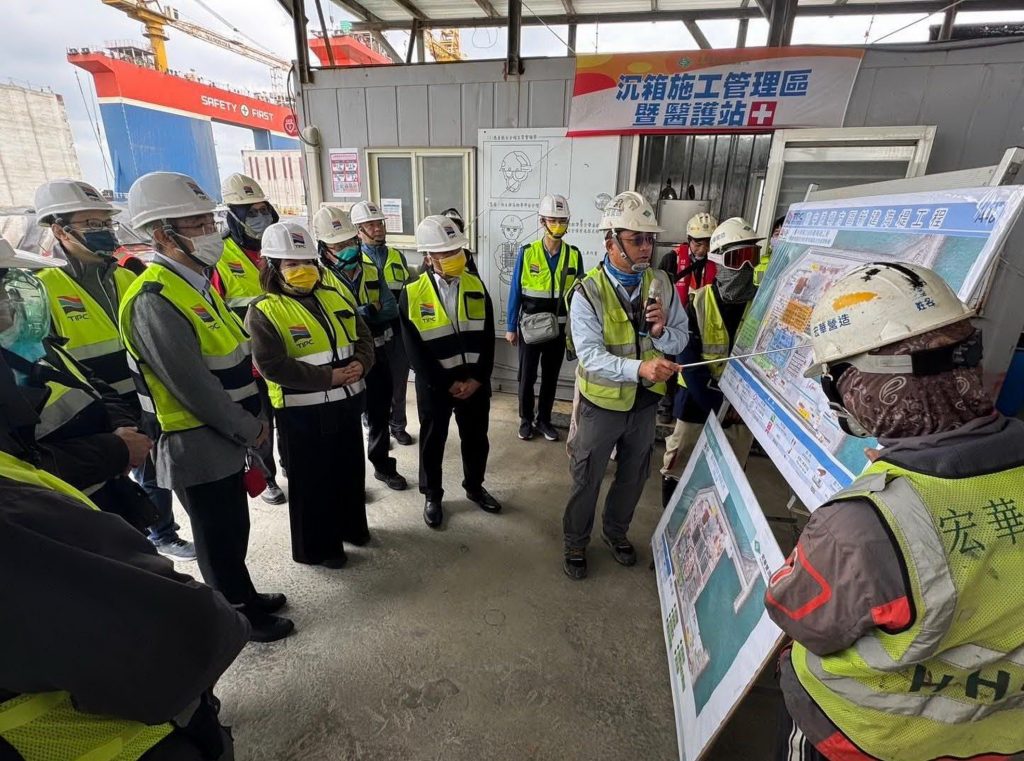 台中港務分公司特別感謝日本學者親臨現場,與工程團隊交流沉箱製作及海事工程經驗,昨日台中港平均風速八至九級,與會日本學者真切體驗到第一線工程團隊的工作環境。