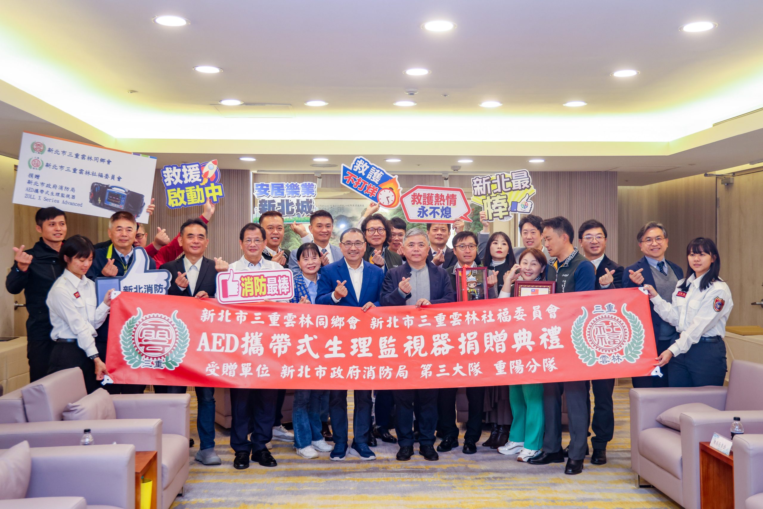 為提升新北市第一線消防人員救護量能,三重雲林同鄉會社會福利委員會十九日捐贈新北市消防局第三救災救護大隊重陽分隊生理監視器一組,市長侯友宜出席代表受贈,感謝三重雲林同鄉會社福委員會的慨舉,協助提升消防夥伴救災救護設備,守護民眾安全。