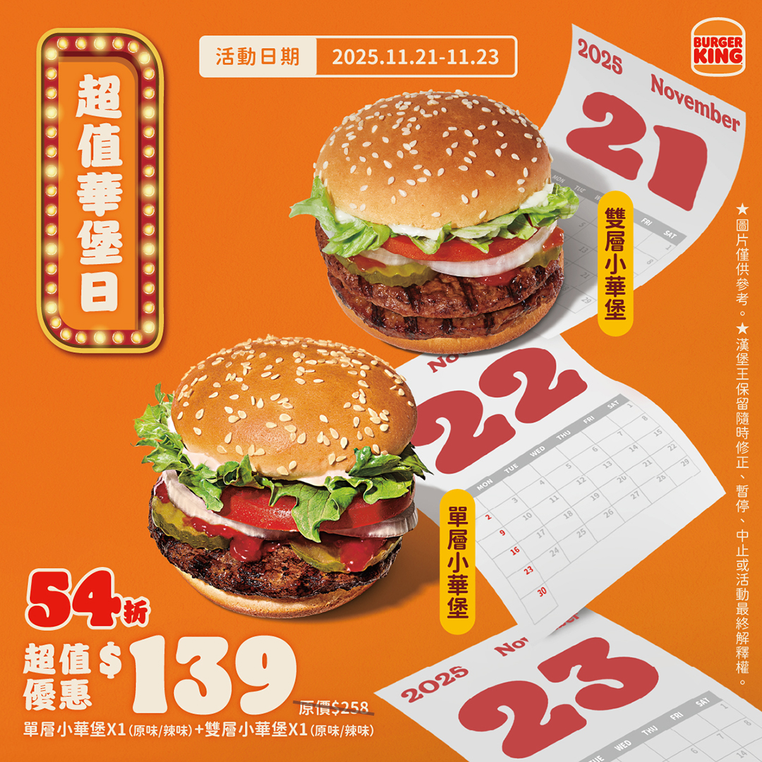 感恩節就要辦感謝祭,漢堡王感念鐵粉們對「華堡」系列的長期支持,11月「華堡日」連三天主打熱量低、美味不減的小華堡,本週五至週日(21至23日)雙層小華堡加單層小華堡,只要139元,直逼54折。下週二(25日)起則推出限時21天的感恩節雙人套餐,美式花生雙層脆雞堡、火烤雞腿培根堡和勁濃培根烤腿堡,3種口味任選2個,搭配2份點心及飲料只要269元,相當64折的超值優惠。