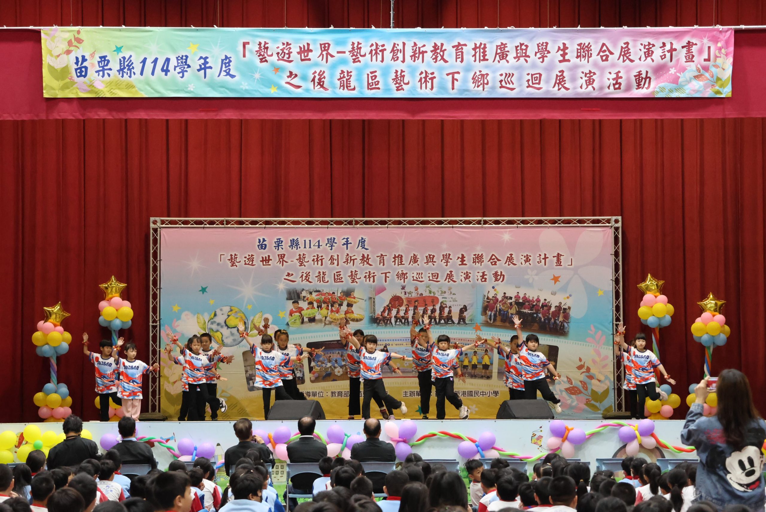 苗栗縣藝術下鄉巡迴展演系列活動首場於二十日,在後龍鎮新港國中小活動中心登場,邀集後龍地區十二所國中小學演出,開場由新港國中小演出〈彩色的苗栗〉揭開序幕,緊接著各校輪番登台,台上孩子們全心投入在表演中,台下觀眾更是熱情掌聲,為他們精湛的演出掌聲鼓勵。