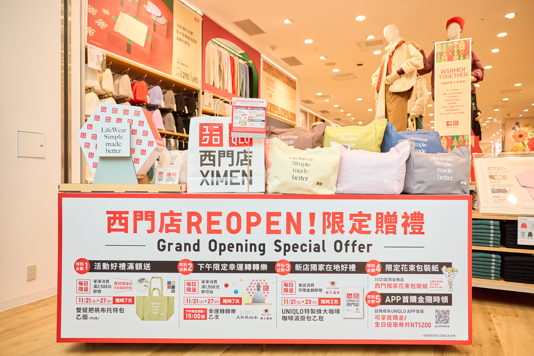為迎接冬季到來,LifeWear 極致日常服秋冬限定優惠同步展開,男裝、女裝與童裝全系列商品一應俱全,西門店同時提供即買即退稅服務,為國際旅客帶來最便利、友善的城市購物體驗。開幕期間,UNIQLO 亦精心規劃多項限定活動與好禮,將滿滿的誠意與驚喜獻給每一位蒞臨西門店的顧客!