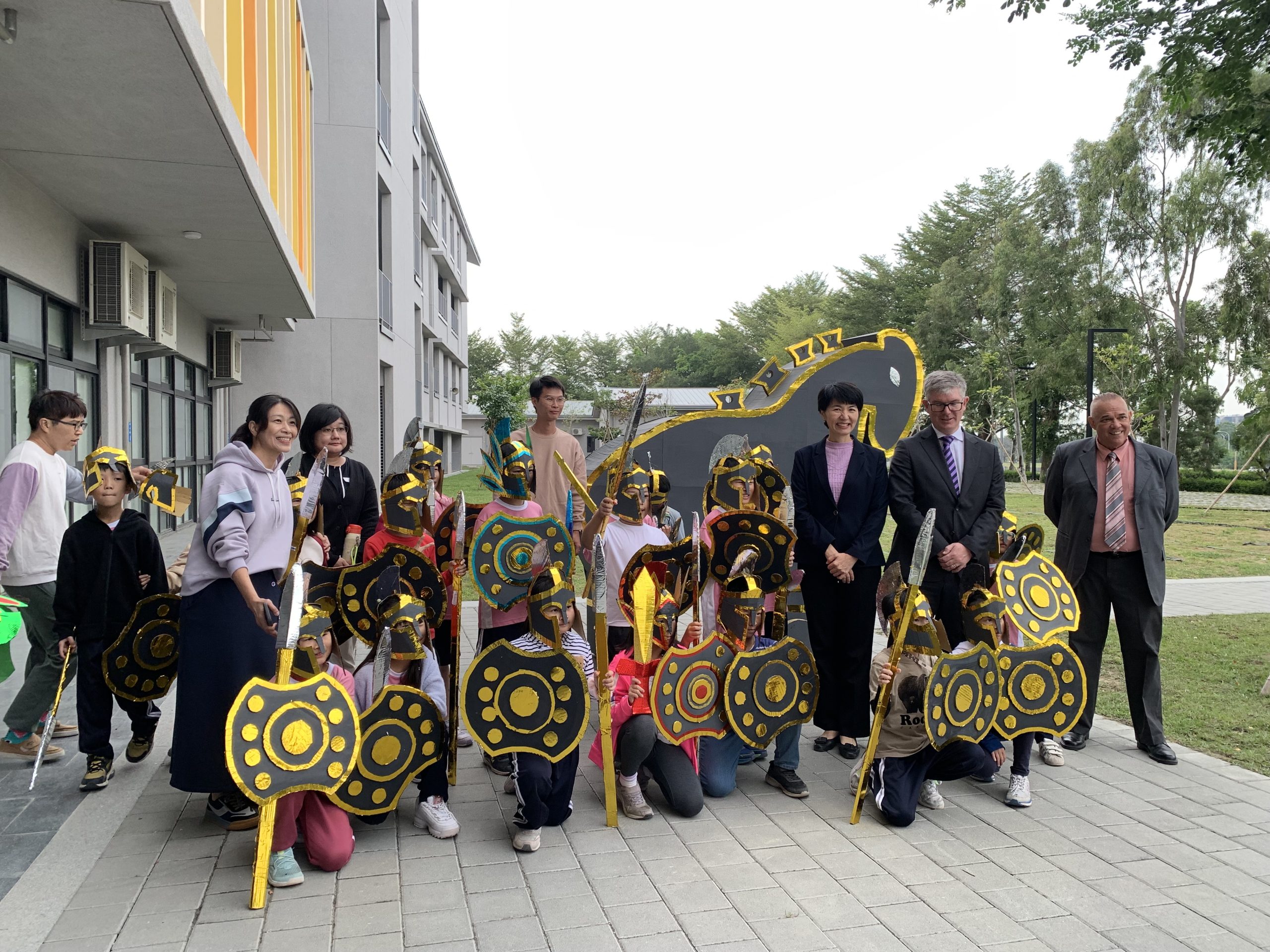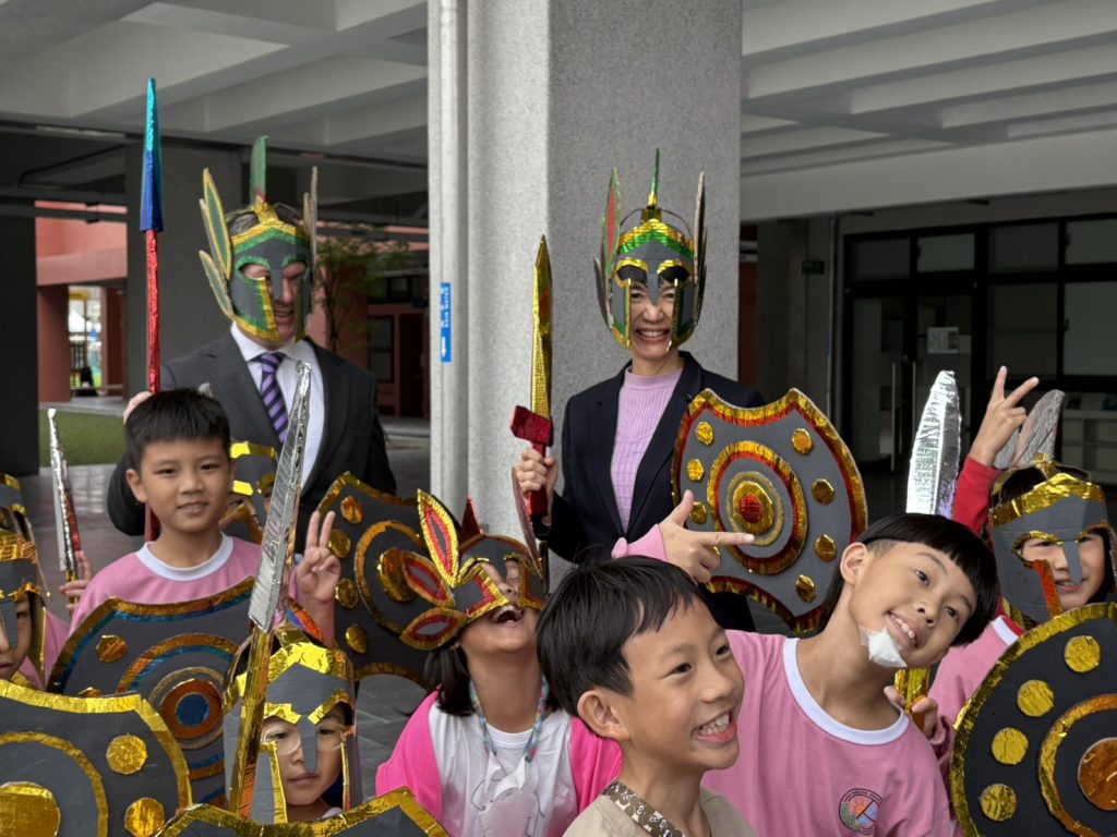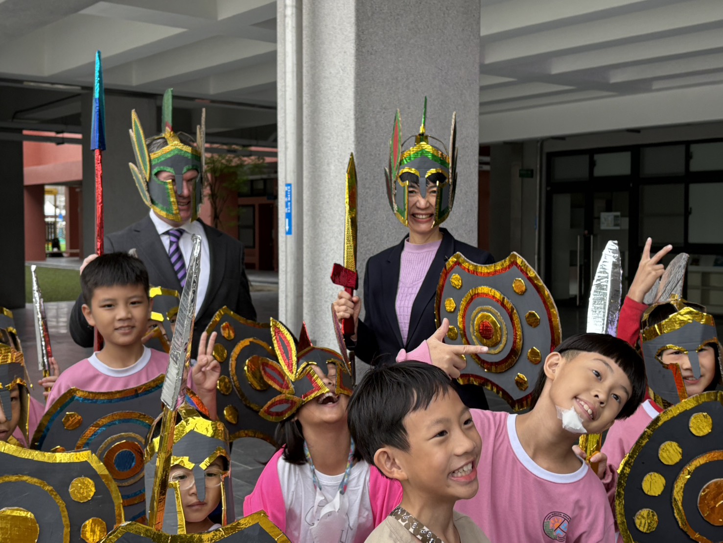 黃詞凰強調,希望透過與英國杜倫公學的跨國連結,為學生鋪設更多元、更具前瞻性的學習途徑,期盼讓更多孩子在跨文化的教育環境中拓展視野、激發潛能,進而培養具備全球素養與競爭力的未來人才。廿日簽約後,黃詞凰也親自引導杜倫公學副校長Mr. Pearson參觀校園環境,當參訪至小學部教學區時,恰巧看到師生正在手作「木馬屠城記」戲劇道具,充滿童趣的手工藝品吸引副校長的目光,副校長更大方戴上木馬造型面具,親切地與沙崙小學部的師生們合影留念,現場洋溢著歡樂溫馨的氣氛。