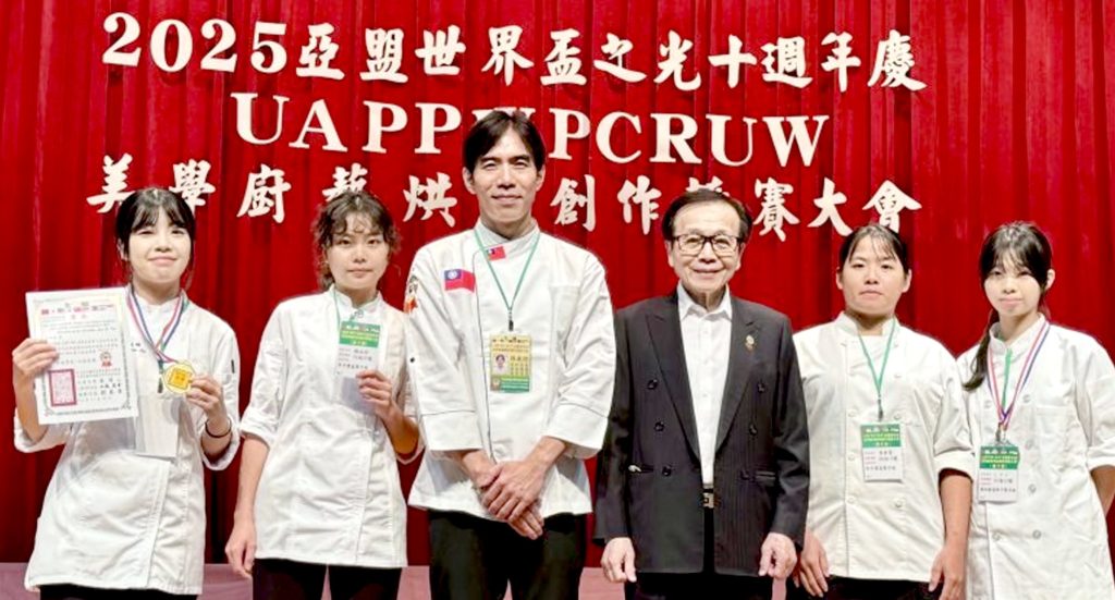 南台科大餐旅管理系助理教授林政陞指導學生郭佳琳、李依蓉、鍾涵羽、紀甯紫團隊,參加二0二五 UAPP WPC RUW亞盟第十屆廚藝烘焙創作競賽,烘焙藝術項目中技冠群雄,囊括三金、一銀,展現南台餐旅紮實的教學成效與金牌烘焙選手養成的卓越實力。