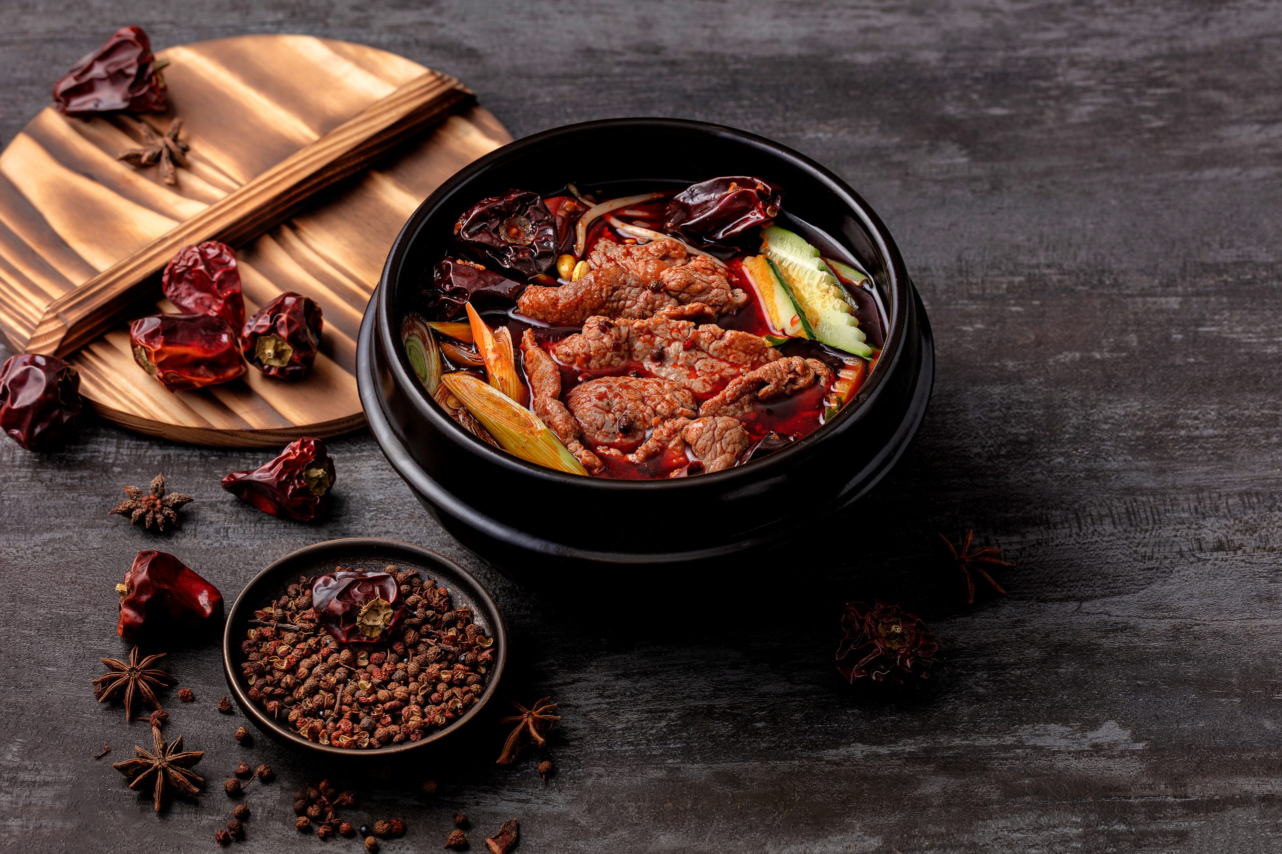 川味水煮鍋靈魂來自主廚以多種辣椒與香料炒製的招牌「辣渣」,肉桂、丁香、燈籠椒、青花椒、朝天椒、宮保辣椒、大紅袍花椒等於熱油中激出香氣,再加入雞高湯,香氣奔放中呈現麻、辣、鮮、香的鮮明風格,搭配牛肉或豬肉一起品嘗,辛香與肉香相互襯托,是冬天最能喚醒味蕾的一款鍋物,每鍋520 元(價格另加一成服務費)。