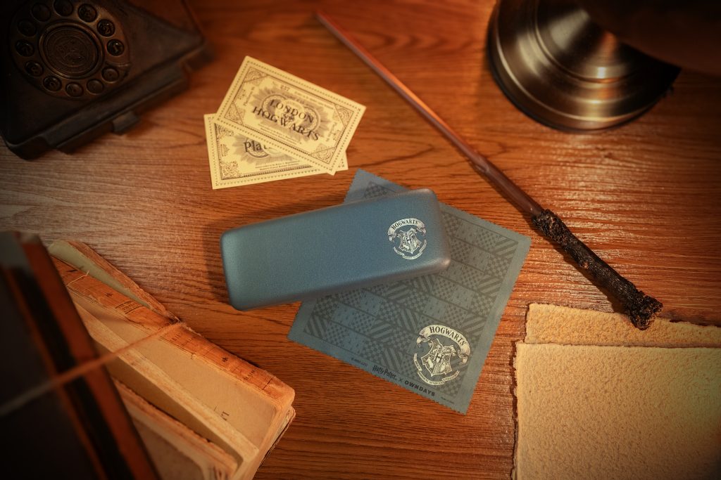專為巫師設計的霍格華茲校徽圖案眼鏡盒與眼鏡布,凡購買任一款聯名眼鏡,即可免費獲得此周邊組合;眼鏡盒充滿魔法道具意象,兼具實用與收藏價值,讓粉絲能將完整的魔法世界隨身帶著走。