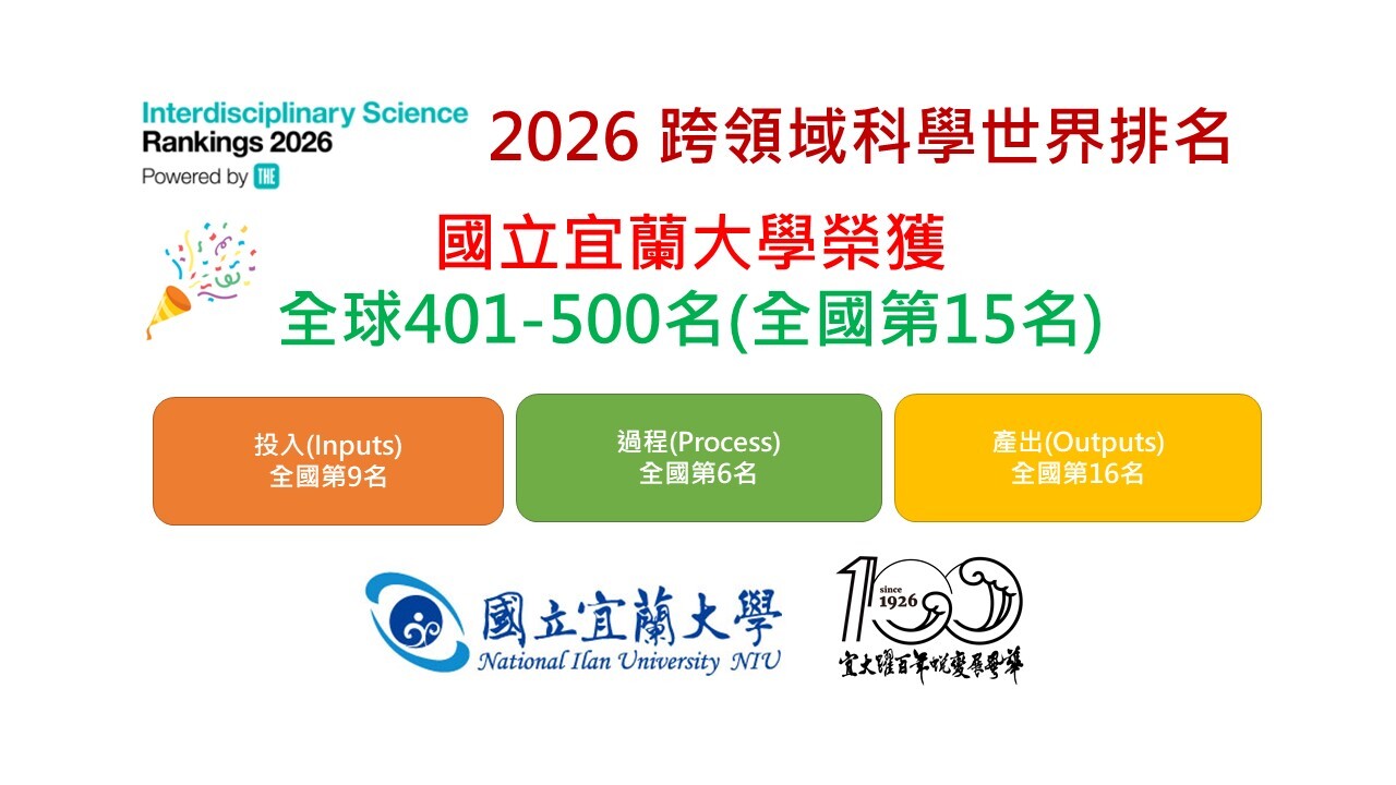 國際高等教育評比機構《泰晤士高等教育》二十日公布二0二六年「THE跨領域科學排名」。國立宜蘭大學首次參與即取得亮眼成績,名列全球第401至500名、全台第十五名(名列國立大學第十名),展現宜大在跨領域研究與教學上的深厚能量與發展潛力。