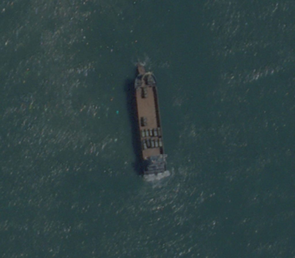 由 Planet Labs 拍攝的衛星影像顯示,一艘甲板貨船於 2025 年 7 月 16 日駛向中國大陸廣東省界勝附近的海灘。 (Planet Labs PBC/路透社提供/檔案照片)