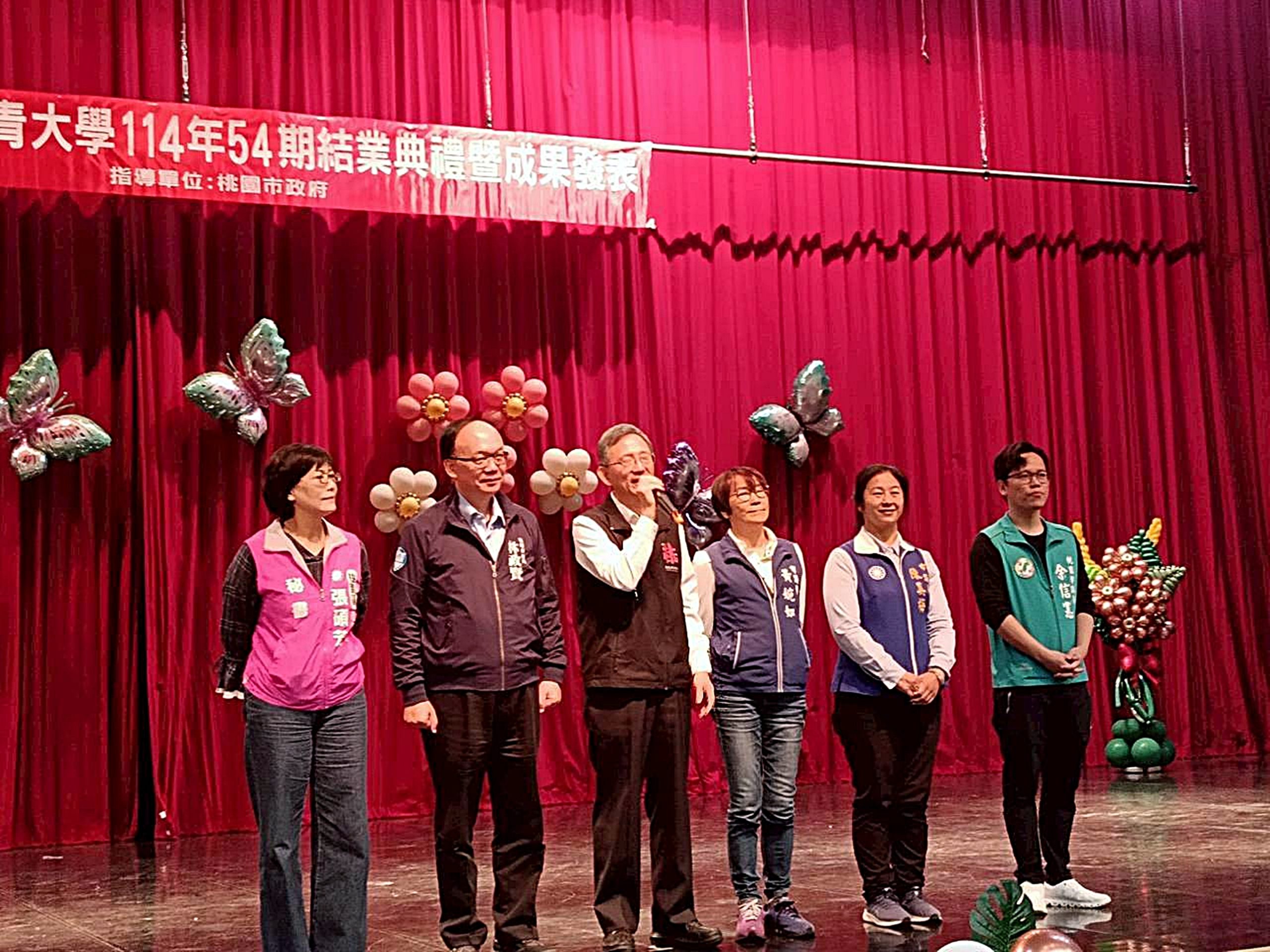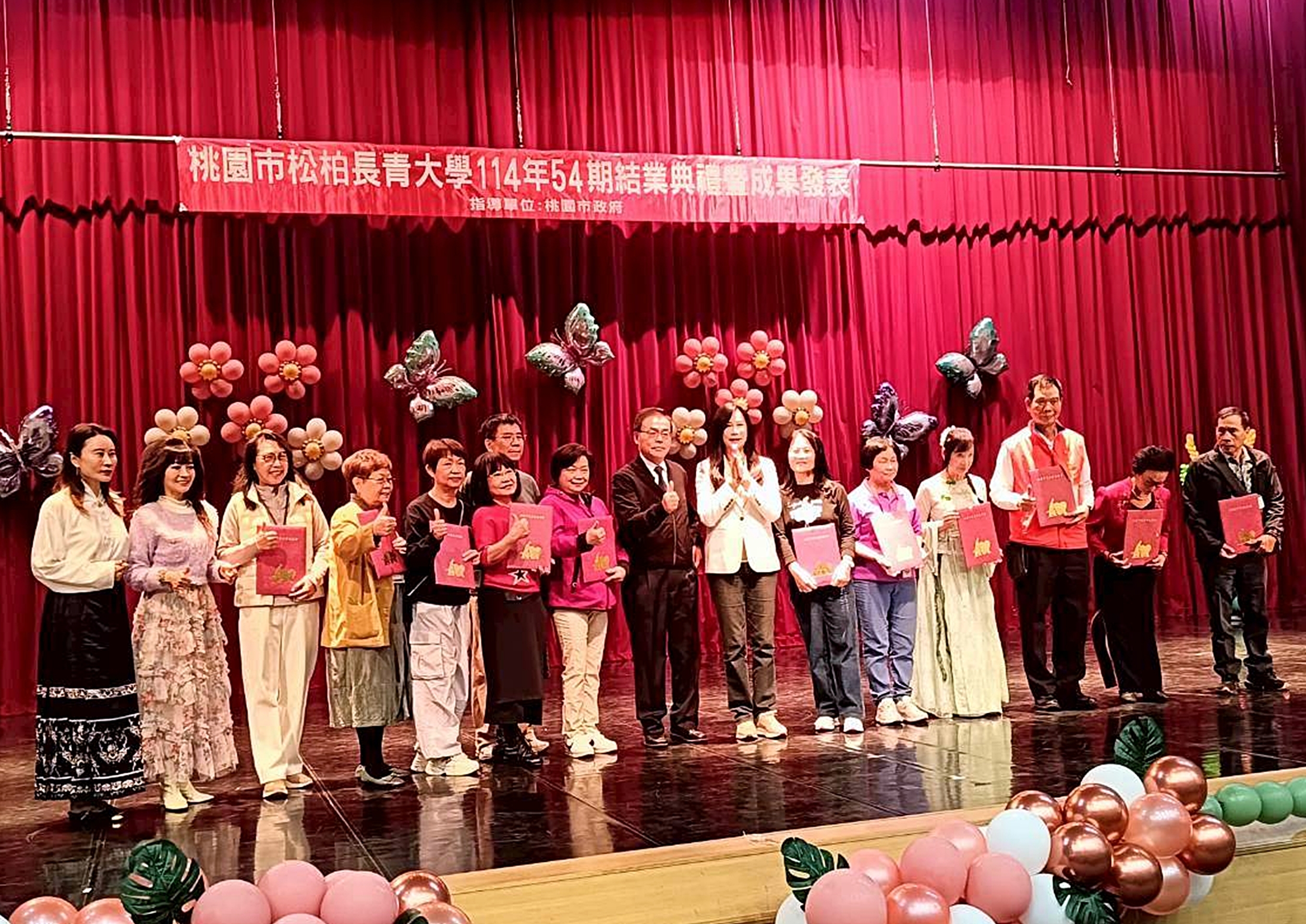 桃園市松柏長青大學第五十四期成果發表暨結業典禮,於二十二日在桃園市立桃園高中演藝廳溫馨舉行。松柏長青大學主任委員呂朝福表示,目前學員超過一千五百名,但演藝廳座位僅可容納四百人,因此本次特別規劃為動態成果發表為主,讓學員以舞蹈、律動與音樂展現最有活力、最精彩的年度成果發表。