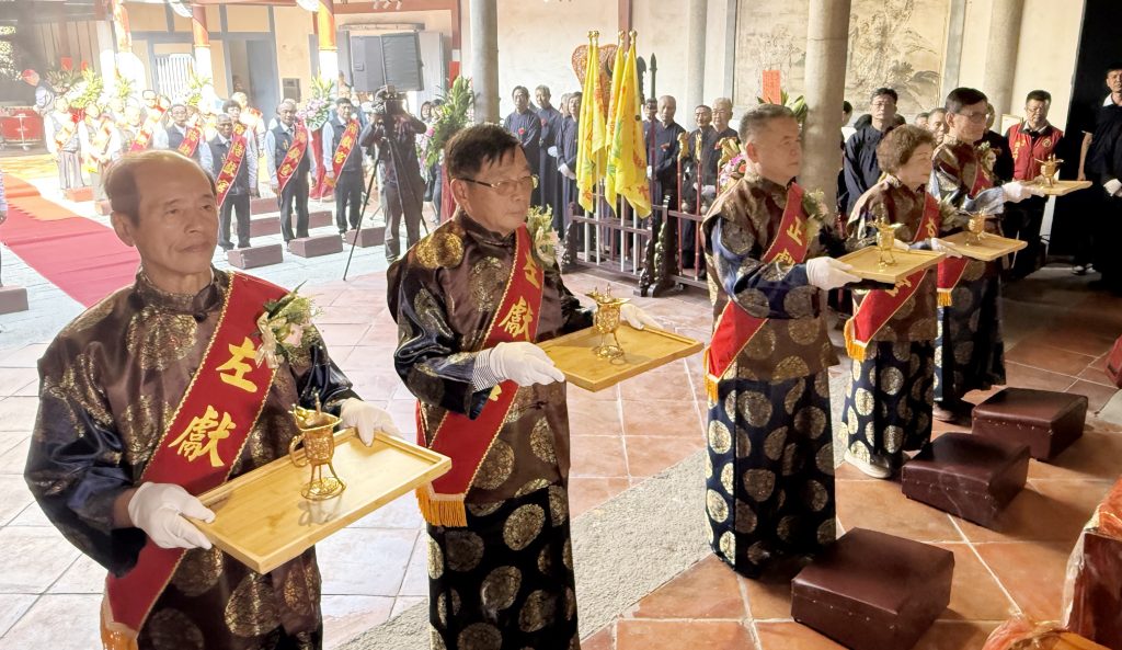 台南市陳氏宗親會二十二日在台南市定古蹟「陳德聚堂」舉辦五十週年慶,來自海內外各地的陳氏宗親代表,以古禮三獻大禮祭祖,場面莊嚴隆重。