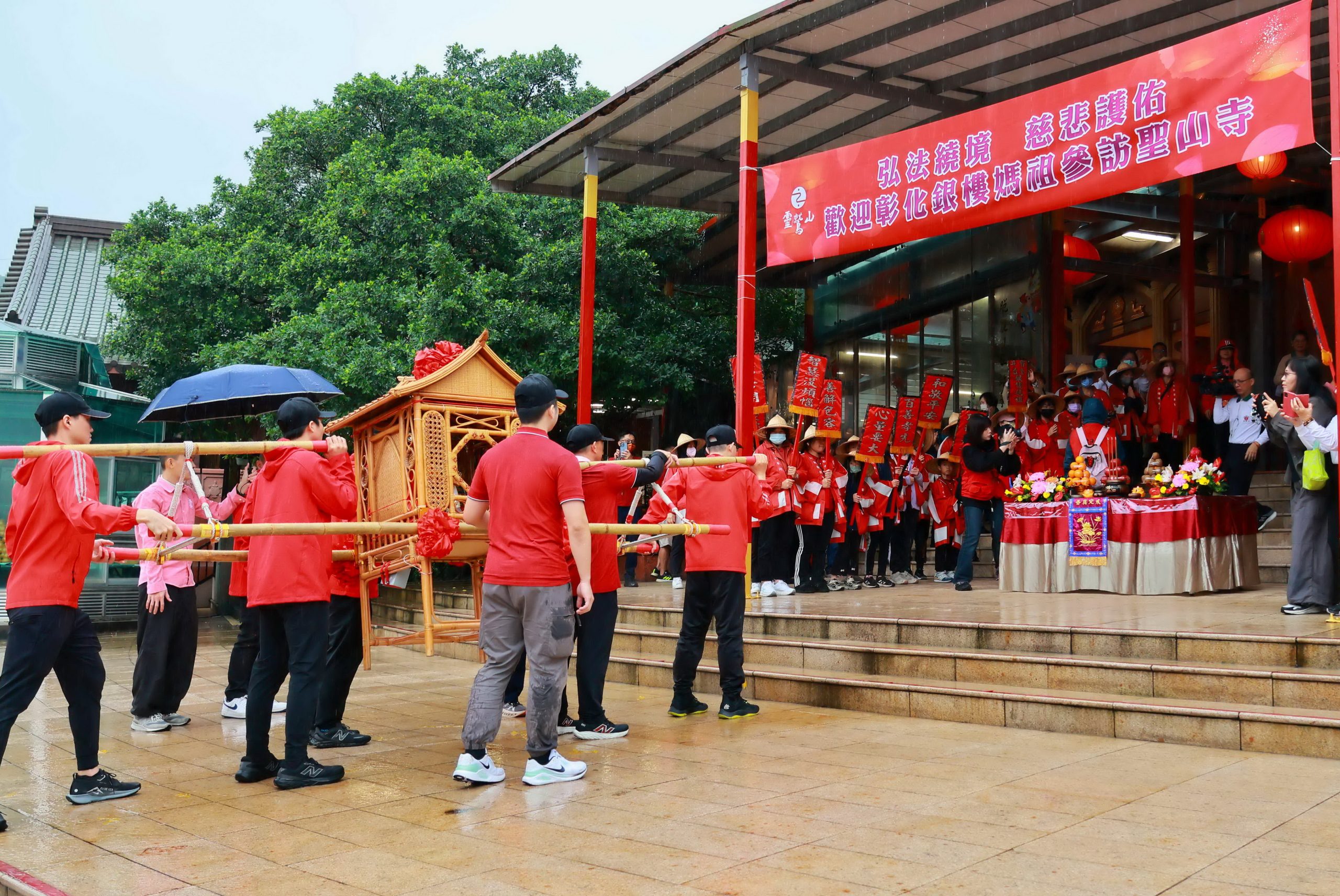 彰化北斗銀樓媽祖逾百名善眾行腳弘法廿二日來到靈鷲山聖山寺,媽祖鑾轎莊嚴進入金佛殿,善眾合十供燈,以香花燈果茶食六供養禮佛,見證跨宗教交流的和合共善;寺方致贈珊瑚觀音念珠給銀樓媽,眾人齊誦《心經》回向四時無災、眾生安穩、合境平安、世界和平。