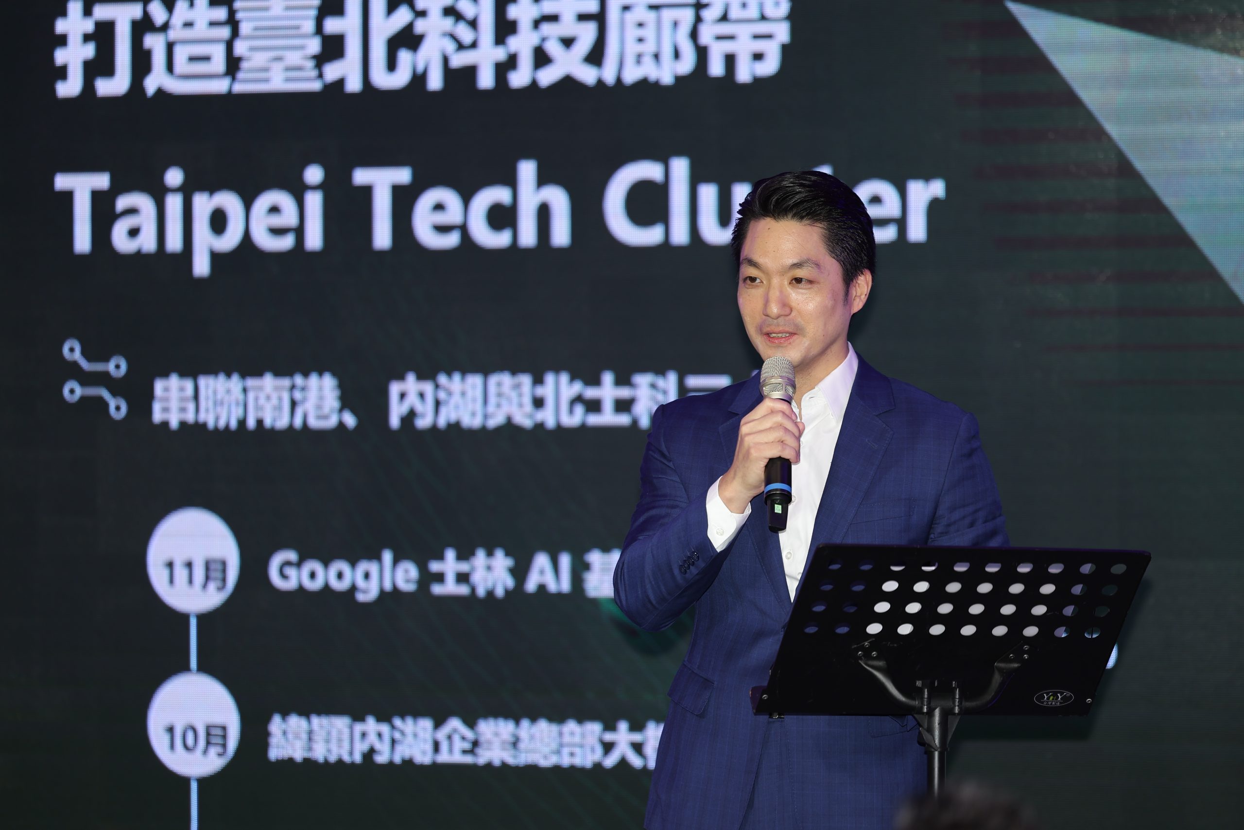 台北市長蔣萬安二十二日表示,希望農曆年前與輝達完成地上權簽約、明年中動工。圖為蔣萬安受邀出席CBMC台灣年會城市論壇並發表演說。  (中央社)
