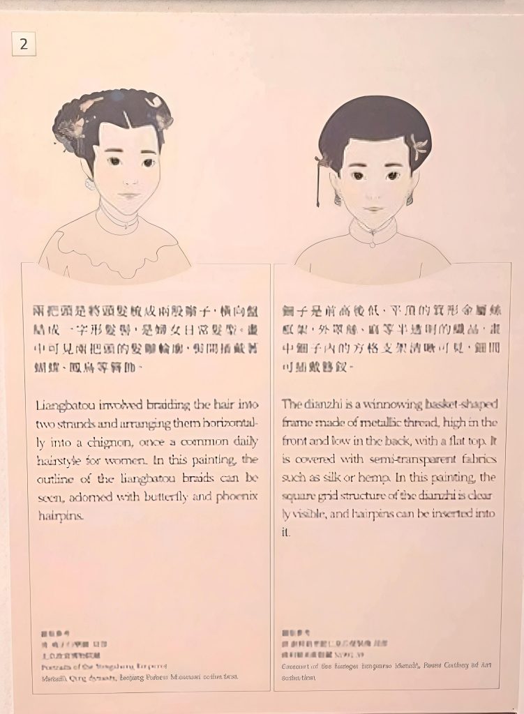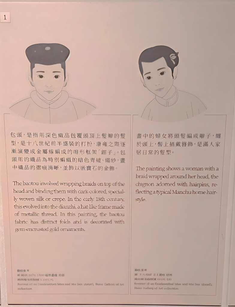 展櫃裡的包頭示意圖雖然樸素,但能讓人理解這種髮式的來源。早期滿洲婦女使用深色布料包覆頭髮,主要是固定作用,外觀沒有太多裝飾。入關後,包頭逐漸在宮廷環境裡變得細緻,布料換成亮緞,邊緣還會加上金線。