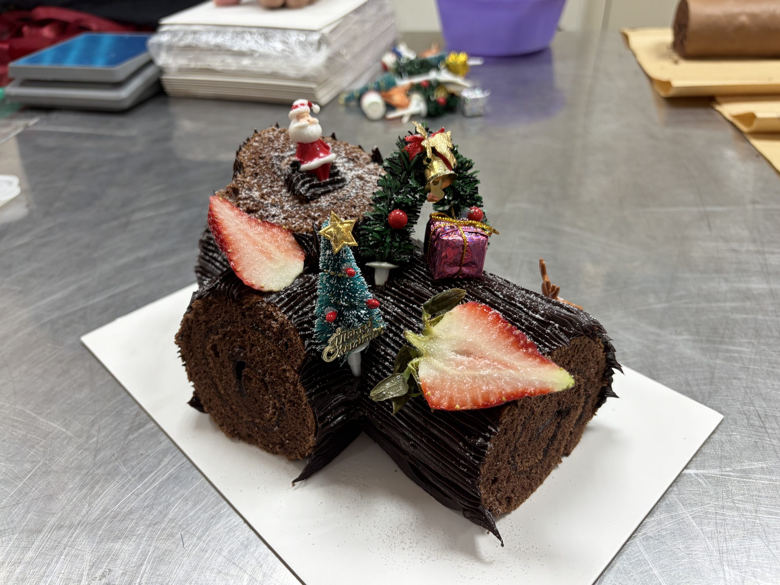 蔡銘在課堂上分享「聖誕樹幹蛋糕」的由來,歐洲早期以柴火過冬的年代,人們會在冬夜由家中最年長者與最年幼者共同點燃壁爐裡的柴薪,並灑上葡萄酒、牛奶與聖水,象徵驅散黑暗、迎向光明與豐收;後來演變為聖誕節製作與分享樹幹蛋糕的傳統。