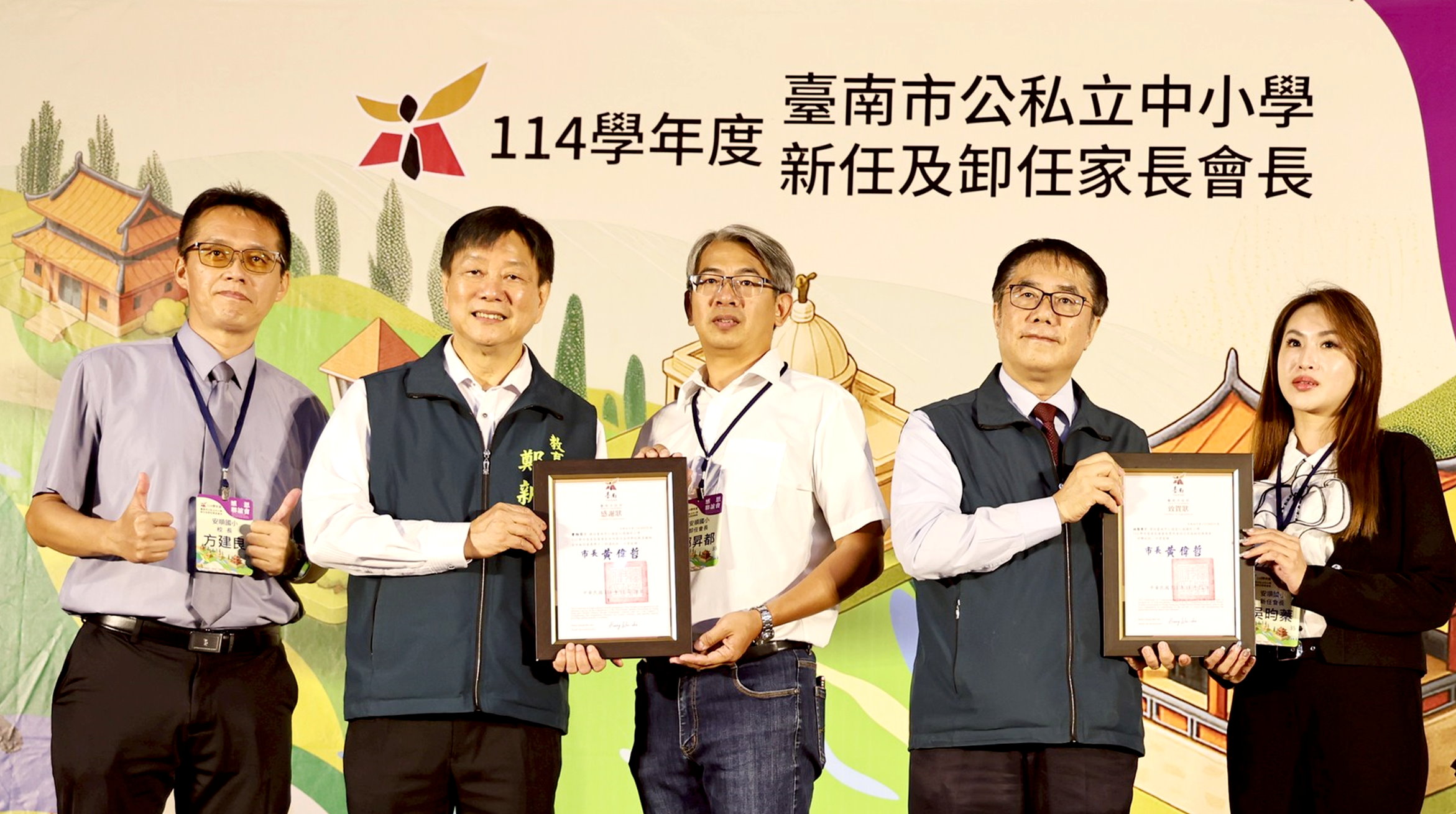 台南市長黃偉哲(右二)頒狀感謝卸任及新任家長會長,肯定家長會對學校校務推動與學生教育的支持與付出。 (市府提供)
