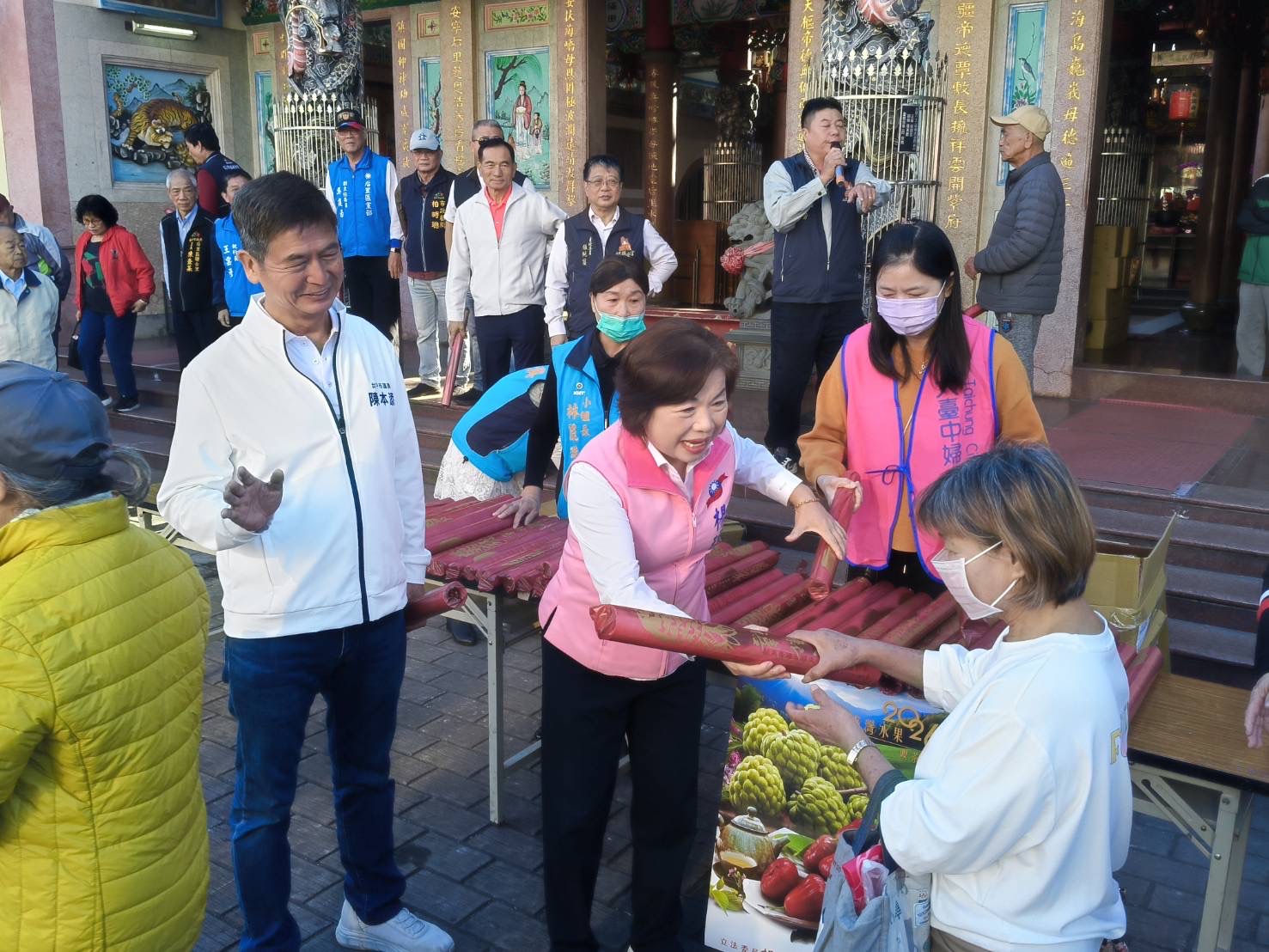 今天台中天氣很不錯,外頭雖仍有點涼意,但可見陽光。楊瓊瓔、陳本添、邱愛珊、后里鎮安宮主委張純賓等人上午8點便在鎮安宮廣場發送水果月曆,索取民眾們排了長長人龍快200公尺。許多民眾見到楊瓊瓔等人士在場親發水果月曆,除紛紛熱情向前要求合影外,也拿起手機拍下楊瓊瓔發放月曆的樣子。楊面對熱情民眾要求合影更是來者不拒。民眾不論是帶上小朋友、或是抱著寵物,通通見者有份。
