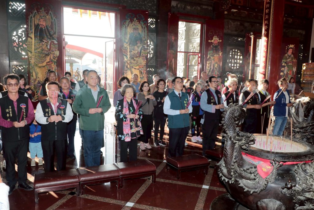 市長黃偉哲(中)偕地方仕紳及信眾於仁安宮殿內焚香祈福,迎接百年難得的北港媽祖南巡盛事,場面莊嚴隆重。 (市府提供)