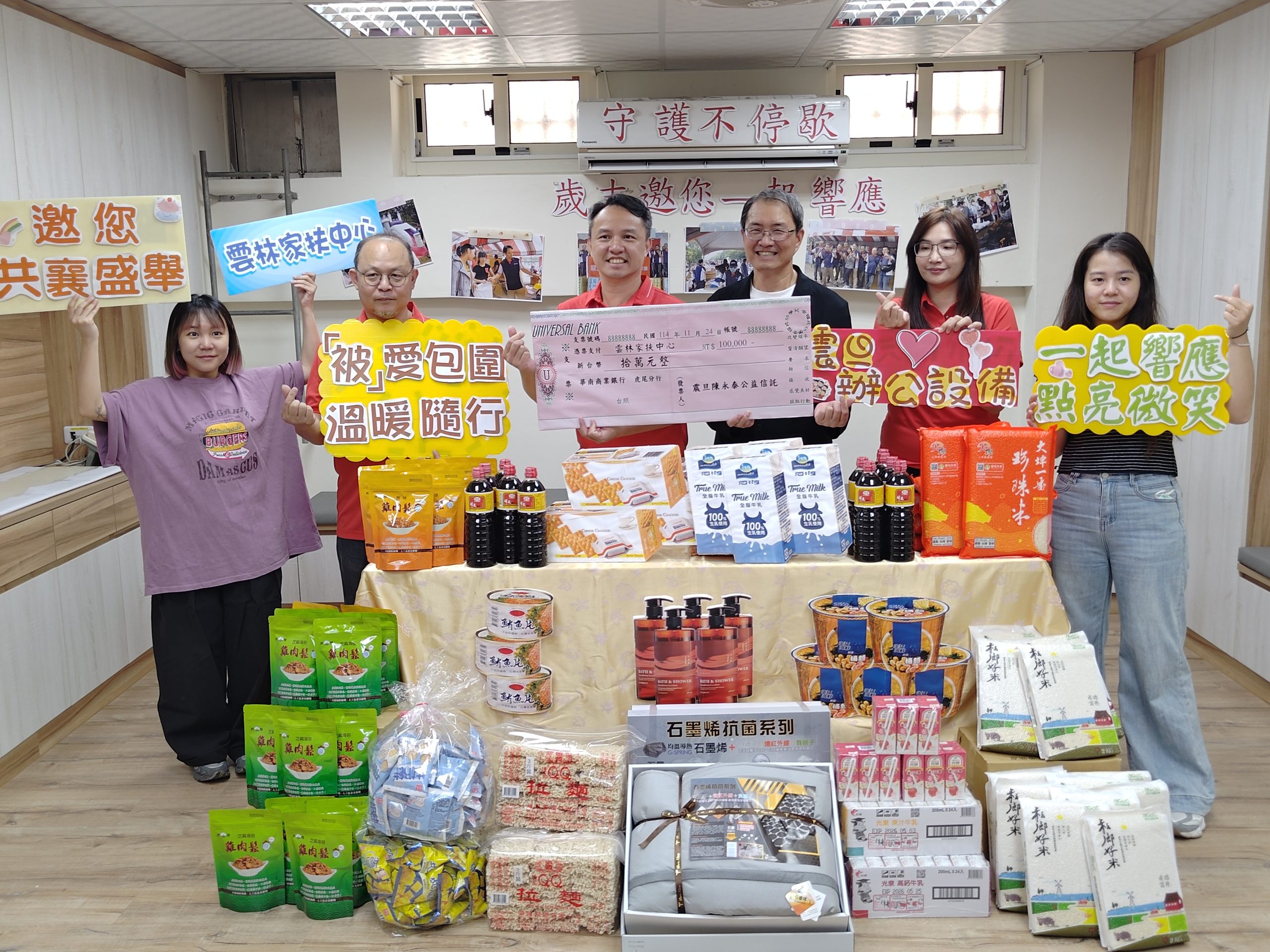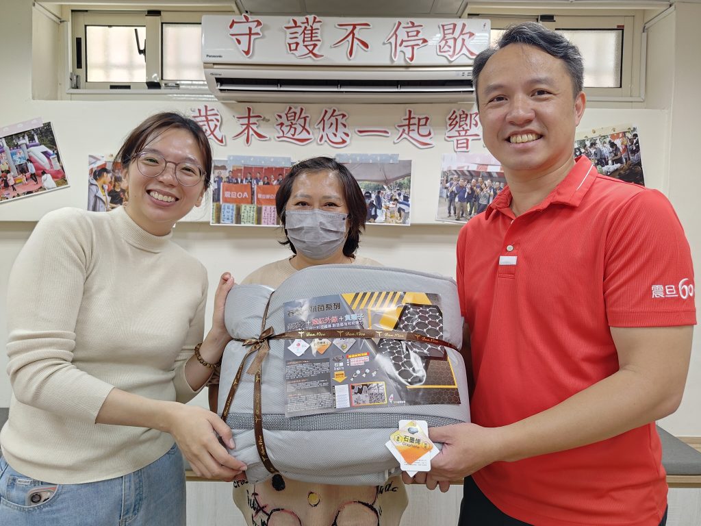 張育維經理及團隊說,家扶歲末贊助款低迷,特與震旦總部將十萬元捐款儘速核撥,穩定家扶社工經費上憂慮。震旦雲林自一○五年起長期力挺家扶,年年同仁投入志願協助,更帶著家人一起送暖發放物資,猶如是雲林震旦『親子家庭日』,籲請各界同伸援手「被」愛包圍家扶扶助家庭。