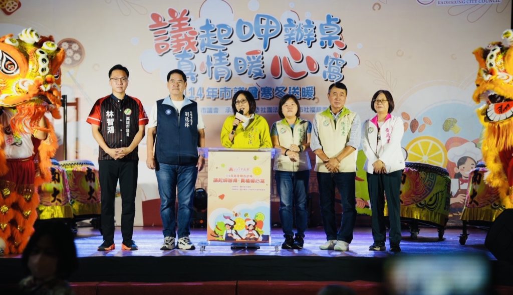 高雄市議會今年寒冬聯合送暖活動廿三日熱鬧舉辦,議長康裕成率議員為近二千戶弱勢邊緣家庭送暖,還邀請內門知名總鋪師阿隆師到場辦桌,在議會繽紛聖誕燈光下暖心開席。