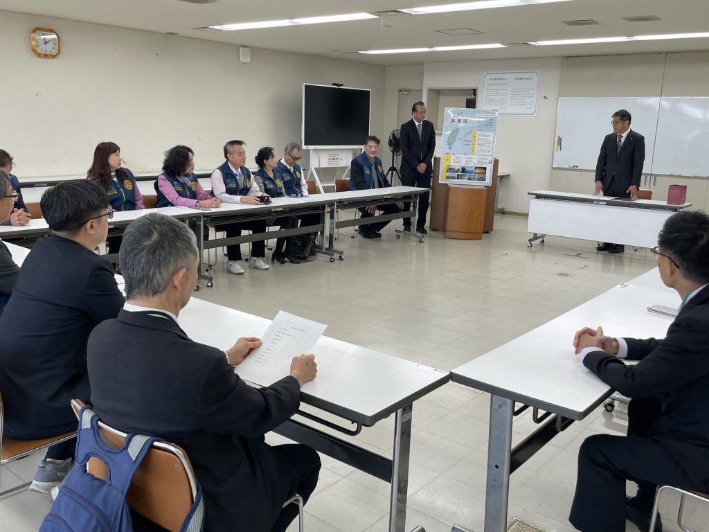 袋井市長大場規之(右立者)致詞表示,將提供必要的行政協助,推動袋井與屏東在防災教育上的交流合作。(楊永年提供)