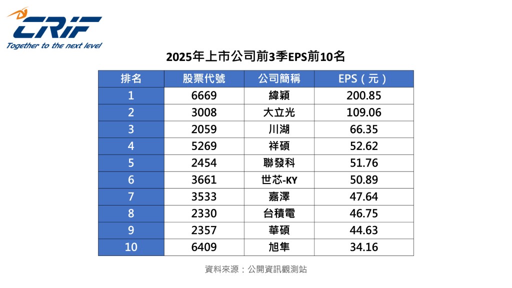 至於前3季EPS(每股盈餘)前10名,則由緯穎以200.85元摘下王座,並大幅領先以EPS109.06元居於第2的大立光(3008)。第3名至第6名EPS也都超過50元,依次為川湖的66.35元,祥碩(5269)的52.62元、聯發科的51.76元,以及世芯-KY(3661)的50.89元。EPS第7至第10名依次則為嘉澤(3533)的47.64元、台積電的46.75元、華碩的44.63元,以及旭隼(6409)的34.16元。整體觀察,前10名中除大立光之外,其餘均為AI相關股。